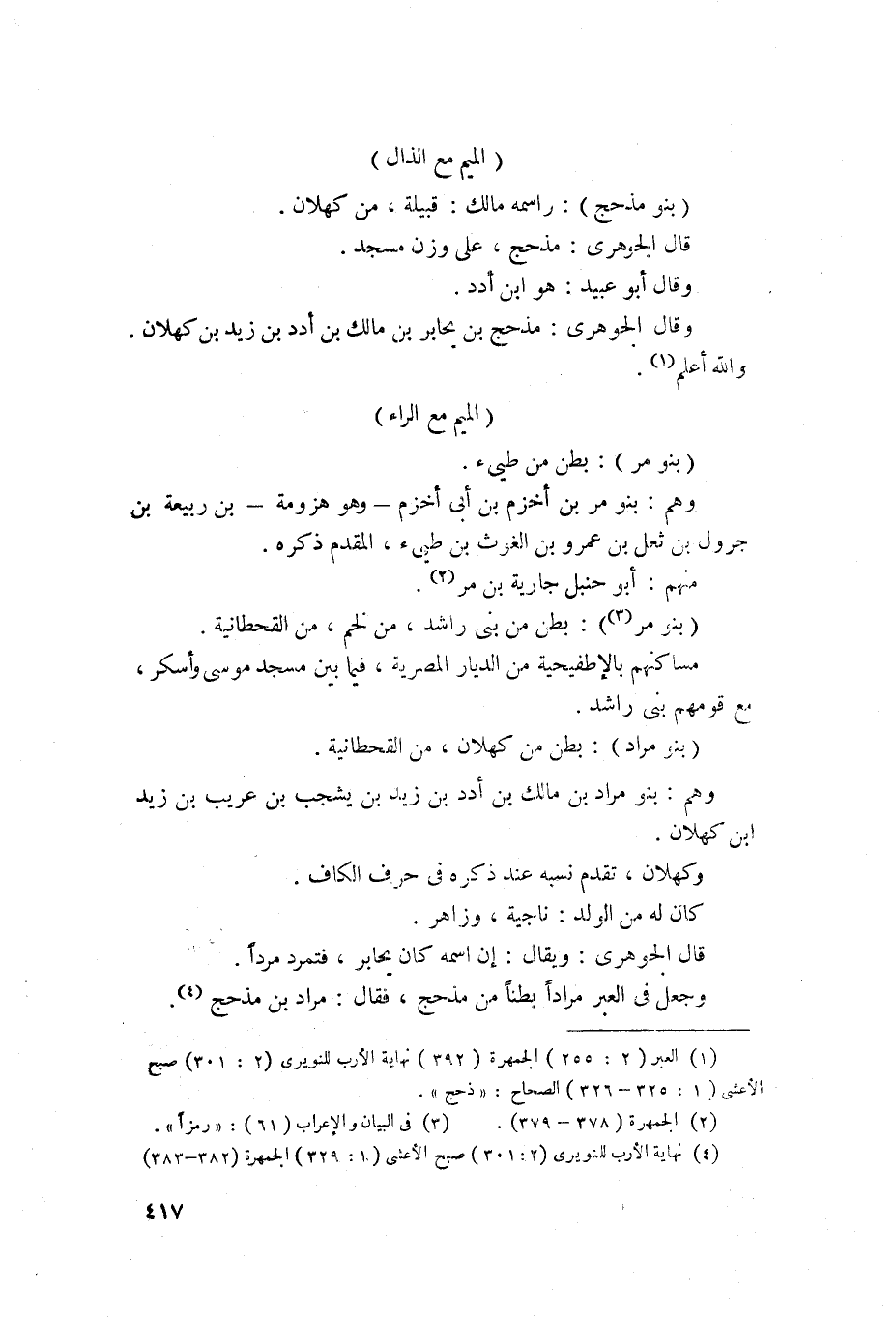 1539 - بنو مر - بطن من طي أيضاً، وهم بنو مر بن حرام بن أبي حرام وهو هزومة بن ربيعة بن جرول بن ثعل بن عمرو بن الغوث بن طي المقدم ذكره، منهم أبو حسد بن مر.