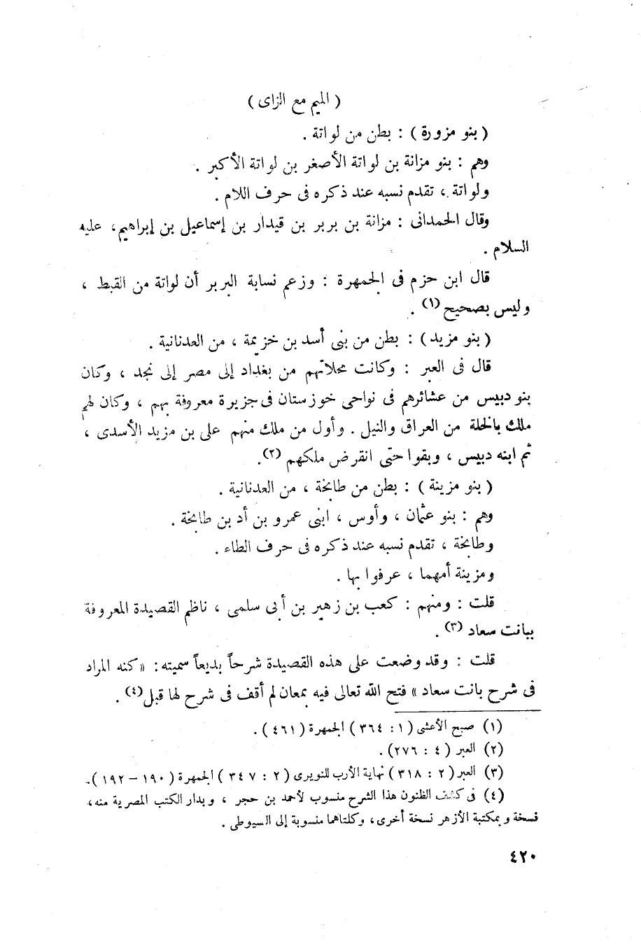 1551 - بنو مزينة - بطن من طابخة من العدنانية، وهم بنو عثمان وأوس ابني عمرو بن أد بن طابخة، وطابخة تقدم نسبه عند ذكره في حرف الطاء، ومزينة امهما عرفوا بها. قلت: ومنهم كعب بن زهير بن ابي سلمى ناظم القصيدة المعروفة ببانت سعاد. قلت وقد وضعت على هذه القصيدة شرحا بديعا سميته كنه المراد في شرح بانت سعاد فتح الله تعالى فيه بمعان لم أقف عليها في شرح لها قبل. وما توفيقي الا بالله عليه توكلت واليه انيب.
