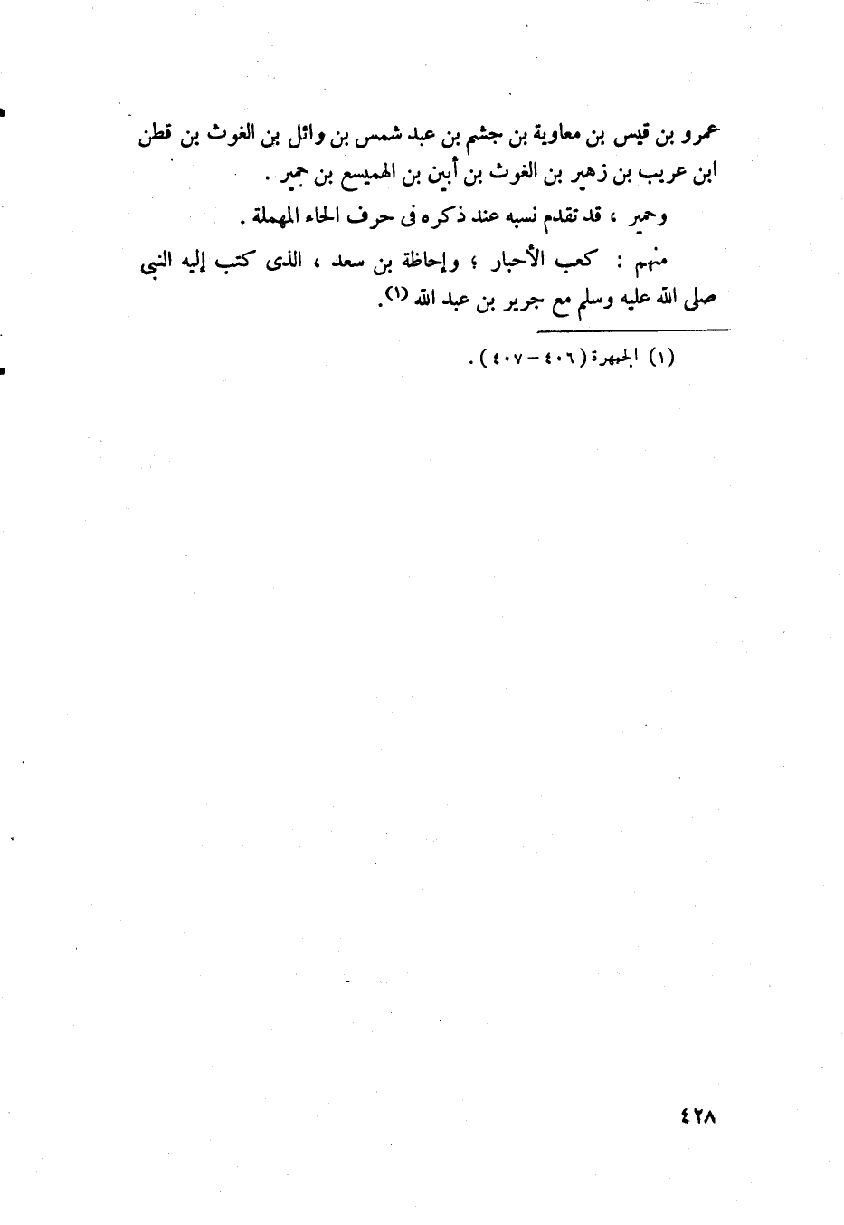 عمرو بن قيس بن معاوية بن جشم بن عبد شمس بن وائل بن الغوث بن قطن بن عريب بن زهير بن الغوث بن ابين ابن الهميسع بن حمير، وحمير تقدم نسبه عند ذكره في حرف الحاء المهملة، منهم كعب الاحبار، واحاطة بن سعد الذي كتب اليه النبي صلى الله عليه وسلم مع جرير بن عبد الله.