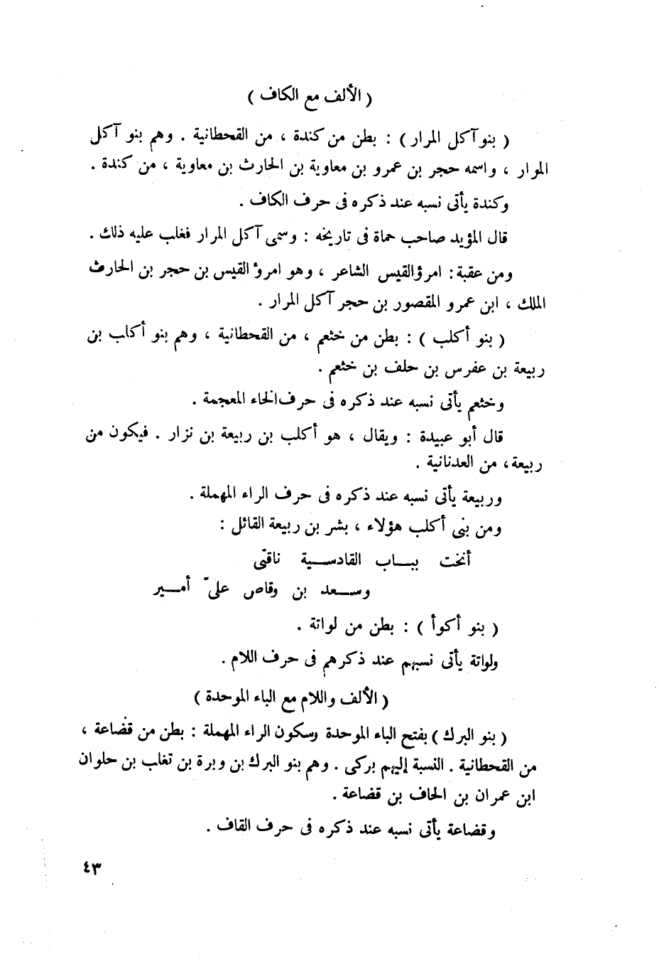 52 - بنوأكلب - بطن من خثعم من القحطانية، وهم بنو أكلب بن عفير ابن حلف بن خثعم، وخثعم يأتي نسبه عند ذكره في حرف الخاء المعجمة. قال أبوعبيدة ويقال هو أكلب بن ربيعة بن نزار وحينئذ يكون من ربيعة من العدنانية، وربيعة يأتي نسبه عند ذكره في حرف الراء المهملة، ومن بني أكلب هؤلاء بشر بن ربيعة القائل: