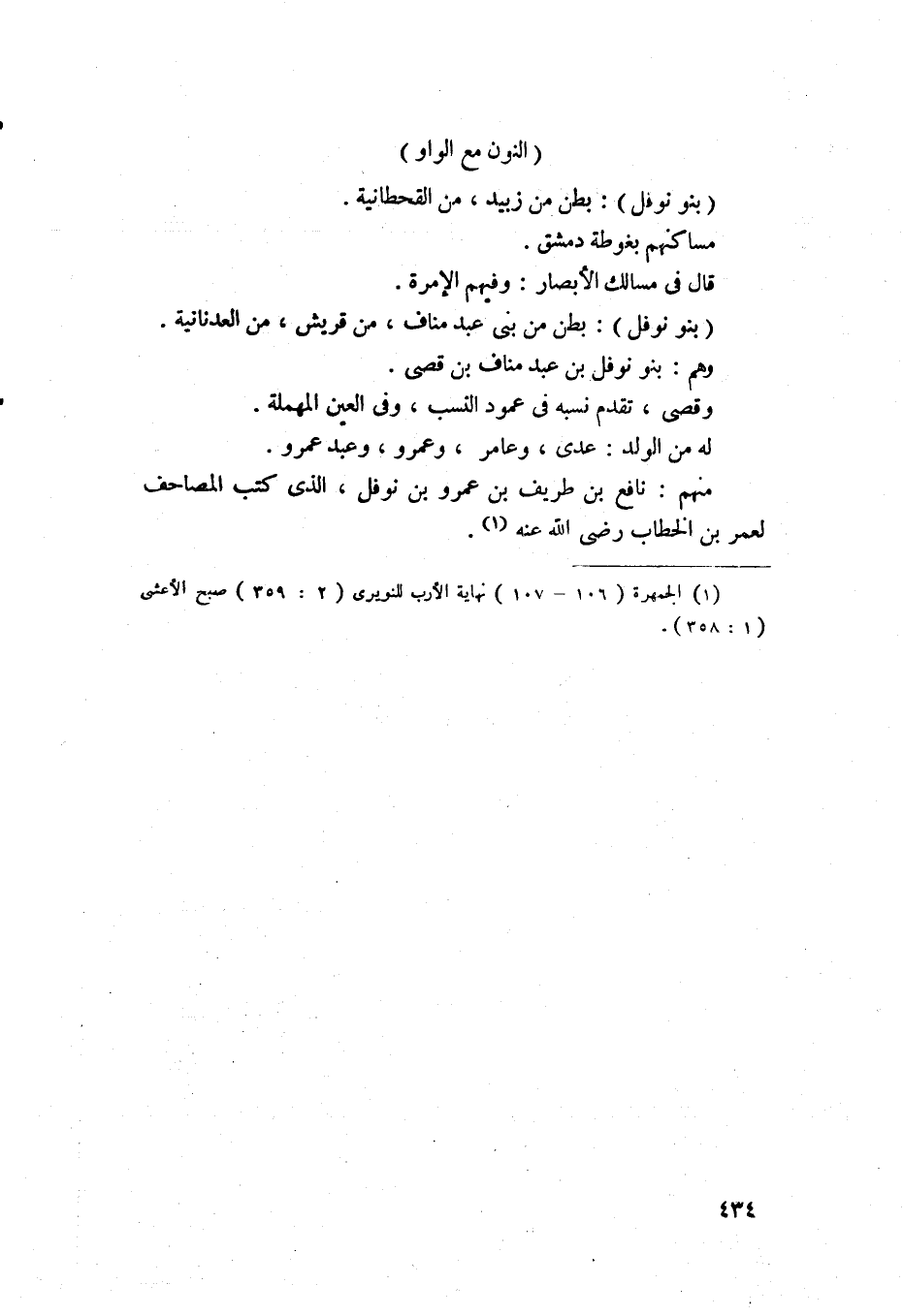 1609 - بنو نوفل - أيضاً - بطن من بني عبد مناف من قريش من العدنانية، وهم بنو نوفل بن عبد مناف بن قصي، وقصي تقدم نسبه في عمود النسب ومر ذكره في حرف العين المهملة له من الولد عدي وعمرو وعامر وعبد عمرو، ومنهم نافع بن طريف بن عمرو بن نوفل الذي كتب المصاحف لعمر بن الخطاب.