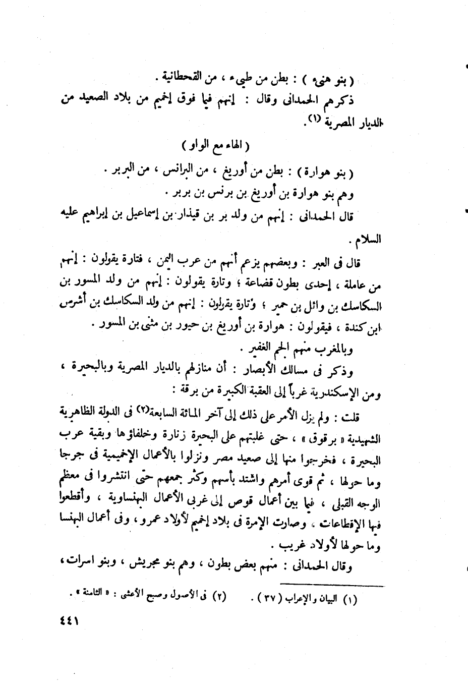 1632 - بنو هوارة - بطن من اوزيغ اوزيفة من البرنس من البربر، وهم بنو هوارة بن اوزيغ بن برنس بن بربر، وقال الحمداني: انهم من ولد بربر بن قيدار بن اسماعيل بن إبراهيم عليه السلام. قال في العبر: وبعضهم يزعم انهم من عرب اليمن، فتارة يقولون انهم من عاملة احدى بطون قضاعة، وتارة يقولون انهم من ولد المسور بن السكاسك بن وائل بن حمير، وتارة يقولون من ولد السكاسك بن اشرس بن كندة، فيقولون هوارة بن اوزيغ بن حيور بن مثنا بن المسور، وبالمغرب منهم الجم الغفير، وذكر في مسالك الابصار: ان منازلهم بالديار المصرية وبالبحيرة، ومن الاسكندرية غربا إلى العقبة الكبيرة من برقة.