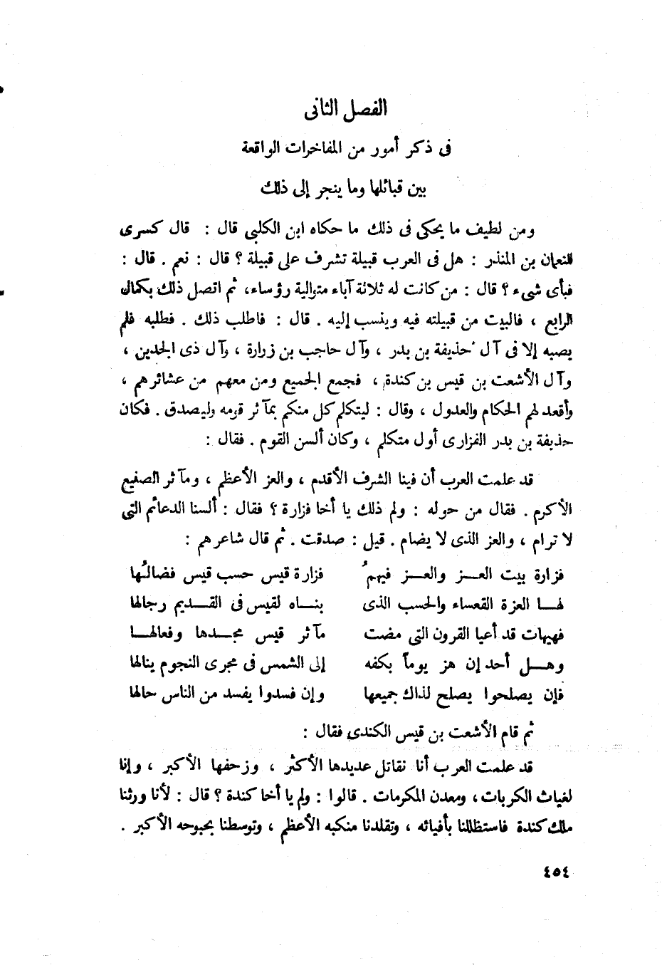 ومن لطف ما يحكى في ذلك ما حكاه ابن الكلبي قال: قال كسرى للنعمان ابن المنذر هل في العرب قبيلة تشرف على قبيلة، قال نعم: قال فبأي شيء قال من كانت له ثلاثة آباء متوالية رؤساء، ثم اتصل ذلك بكمال الرابع، فالبيت من قبيلته فيه وتنسب اليه، قال: فاطلب ذلك فطلبه فلم يصبه الا في آل حذيفة بن بدر، وآل حاجب بن زرارة، وآل الاشعث بن قيس بن كندة، فجمع الجميع ومن معهم من عشائرهم، واقعد لهم الحكام والعدول. وقال: ليتكلم كل رجل منكم بمآثر قومه وليصدق، فكان حذيفة بن بدر الفزاري أول متكلم، وكان ألسن القوم فقال: قد علمت العرب ان فينا الشرف الأقدم، والعز الاعظم، ومآثر الصنيع الأكرم، فقال من حوله: ولم ذلك يا أخا فزارة، فقال: ألسنا الدعائم التي لا ترام، والعز الذي لا يضام، قيل صدقت ثم قال شاعرهم: