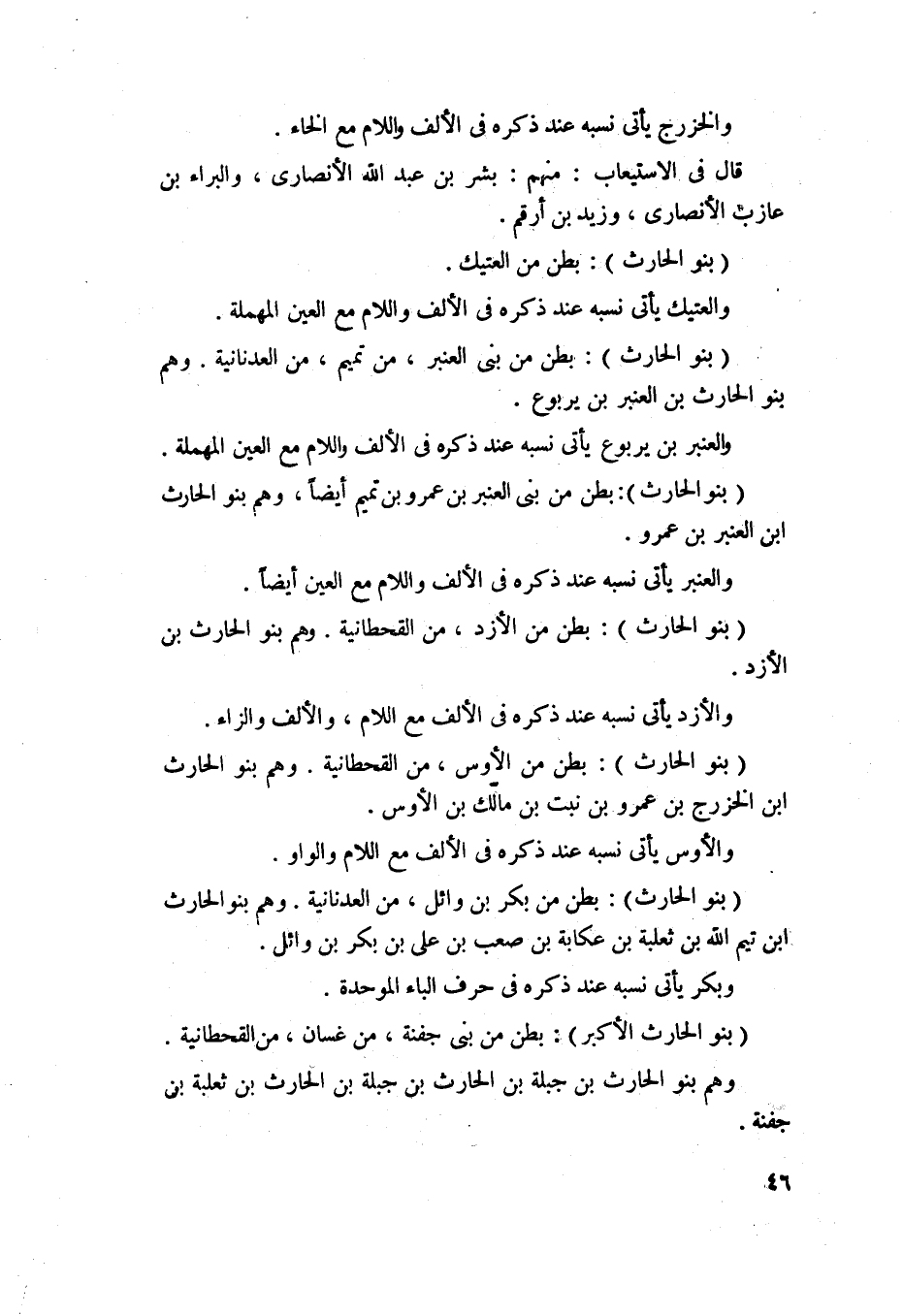 66 - بنو الحارث - بطن من بني العنبر من تميم من العدنانية، وهم بنو الحارث بن العنبر بن يربوع، والعنبر بن يربوع يأتي نسبه عند ذكره في الألف واللام مع العين المهملة.