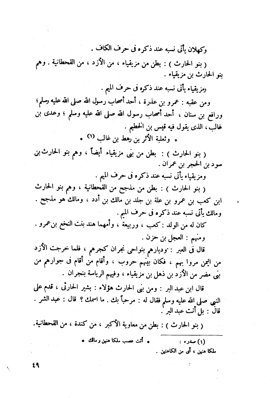 87 - بنو الحارث - بطن من مذحج من القحطانية، وهم بنو الحارث بن كعب بن عمرو بن علة بن جلد بن مالك بن أدد، ومالك هو مذحج، يأتي نسبه عند ذكره في حرف الميم. كان له من الولد كعب وربيعة، وأمهما هند بنت النخع بن عمرو، ومنهم الحجل بن حزن. قال في العبر: وديارهم بنواحي نجران من المين مجاورين فيها بنى ذهل بن عمرو ومزيقيا قال: وكانت بنجران لجرمهم، فلما خرجت الأزد من اليمن مروا بهم فكان بينهم حروب، وأقام من أقام في جوارهم من بني نصر بن الأزدي وبني ذهل بن مزيقيا وفيهم الرياسة بنجران. قال بن عبد البر: ومن بني الحارث هؤلاء بشير الحارثي قدم على النبي صلى الله عليه وسلم فقال له مرحبا بك ما اسمك قال أكير قال له بل أنت بشير.
