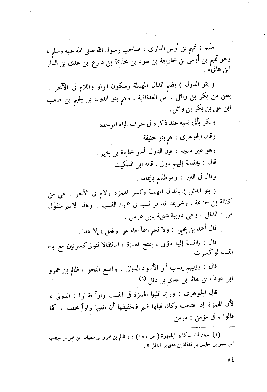 109 - بنو الدئل - بضم الدال المهملة وكسر الهمزة ولام في الآخر - حي من كنانة بن خزيمة ومن العدنانية، وهم بنو الدئل بن بكر بن عبد مناة بن كنانة بن خزيمة، وخزيمة قد مر نسبه في عمود النسب، وهذا الاسم منقول عن الدئل وهي دويبة شبيهة بابن عرس. قال أحمد بن يحيى: ولا نعلم اسما جاء على فعل الا هذا. قال الاخفش: والنسبة إليه دءلي - بفتح الهمزة - استثقالا لتوالي الكسرتين مع ياء النسبة لو كسرت. قال واليهم ينسب أبو الاسود الدؤلي واضع النحو، وهو ظالم بن عمرو بن سليمان بن عوف بن تغانة بن عدي بن دؤل. قال الجوهري: وربما قلبوا الهمزة في النسب واواً فقالوا: الدؤلي. لأن الهمزة إذا فتحت وكان قبلها ضم فتخفيفها أن يقلبها واواً حضة كما قالوا في مؤمن مومن.