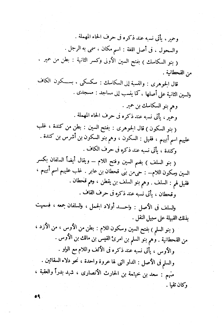124 - بنو السلف - بضم السين وفتح اللام، ويقال لهم أيضاً السلفان بكسر السين وسكون اللام، حي من بني قحطان بن عامر غلب عليهم اسم ابيهم فقيل لهم السلف وهم بنو السلف بن يقطن، وهو قحطان، وقحطان يأتي نسبه عند ذكره في حرف القاف. والسلف في الأصل واحد أولاد الحجل، والسلفان جمعهم فسميت بذلك القبيلة على سبيل النقل.