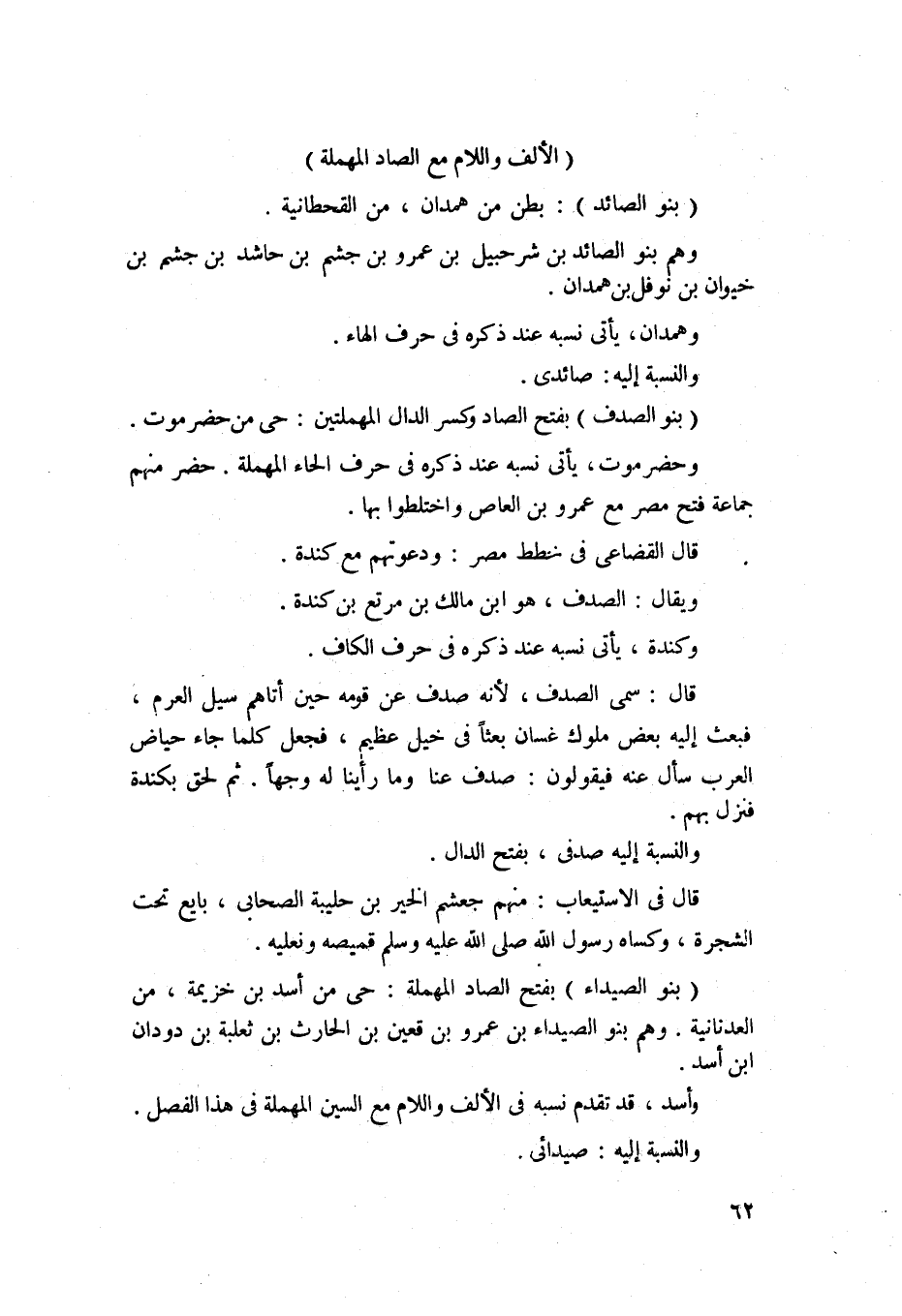 134 - بنو الصيدا - بفتح الصاد المهملة. حي من أسد بن خزيمة من العدنانية، وهم بنو الصيدا بن قعين بن الحارث بن ثعلبة بن دودان بن أسد، وأسد قد تقدم نسبه في اللف واللام مع السين المهملة في هذا الفصل، والنسبة إليه صيدائي وصيداوي.