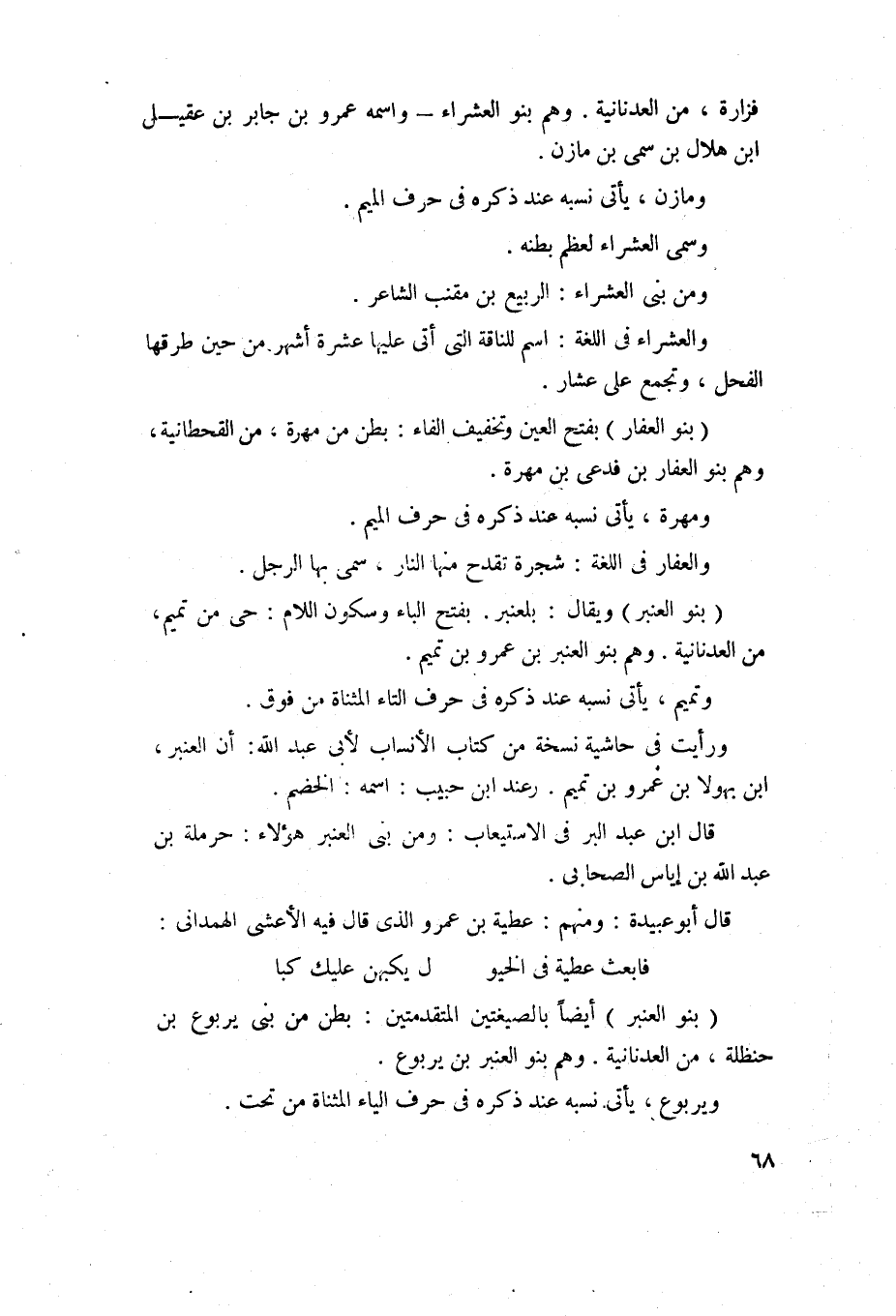 156 - بنو العنبر - ويقال بلعنبر - بفتح الباء وسكون اللام، حي من تميم من العدنانية وهم بنو العنبر بن عمرو بن تميم، وتميم يأتي نسبه عند ذكره في حرف التاء المثناة من فوق، ورأيت في حاشية نسخة من كتاب الانساب لأبي عبيدة أن العنبر ابن بهر الان بن عمرو بن تميم، وان ابن حبيب اسمه الخضم، قال ابن عبد البر في الاستيعاب: ومن بني العنبر هؤلاء حرملة بن عبد الله بن أياس الصحابي. قال أبو عبيدة: ومنهم عطية بن عمرو الذي قال فيه اعشى همدان: