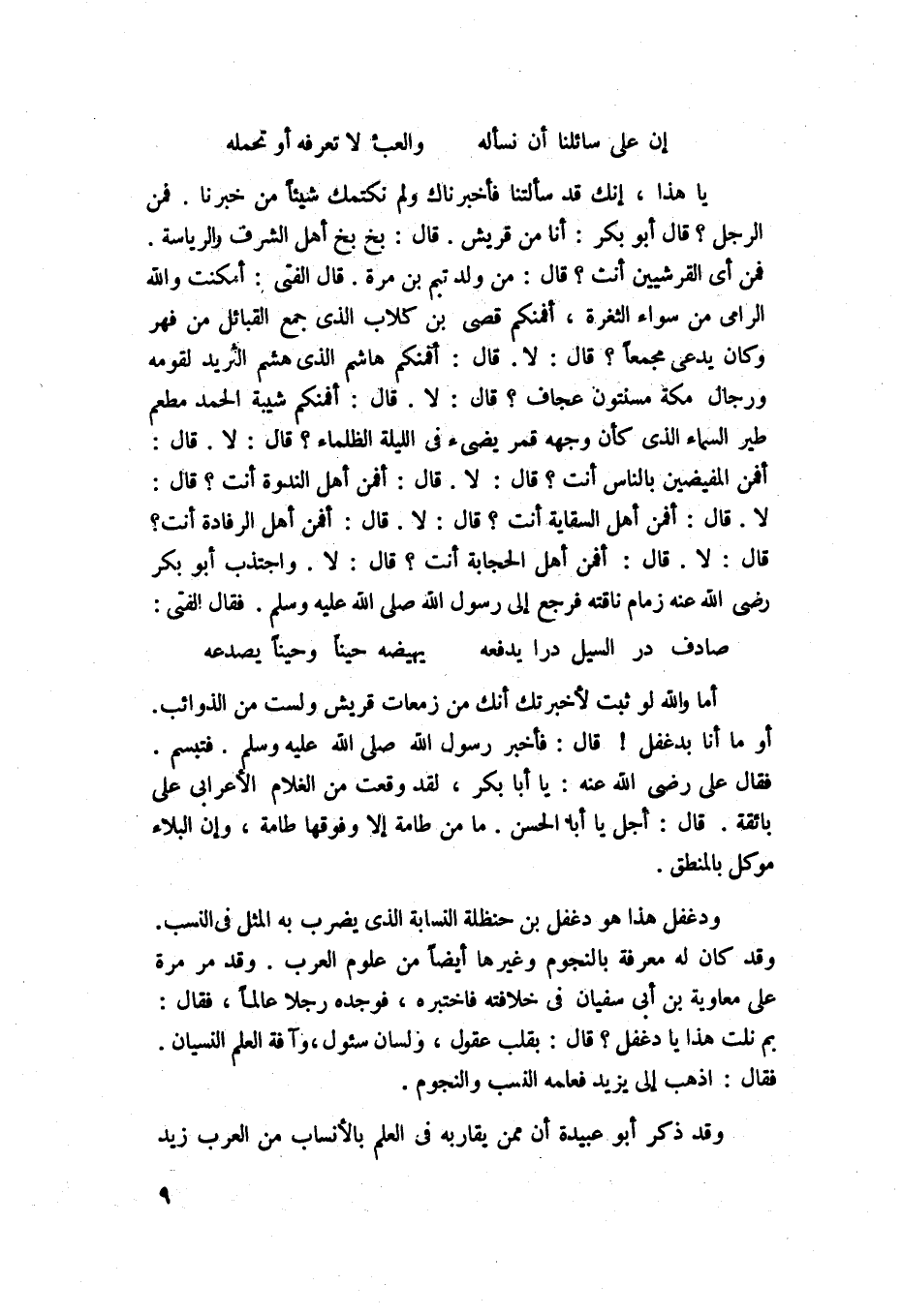 يا هذا إنك قد سألت فأخبرناك ولم نكتمك شيئاً من خبرنا فممن الرجل؟ قال أبو بكر: أنا من قريش. قال بخ بخ أهل الشرف والرئاسة. فمن أي القرشيين أنت؟ قال: من ولد تيم بن مرة. قال الفتى: امكنت والله الرامي من صفاء الثغرة. أفمنكم قصي بن كلاب الذي جمع القبائل من فهر وكان يدعى مجمعاً؟ قال: لا. قال: أفمنكم هاشم الذي هشم الثريد لقومه، قال: لا. قال: أفمنكم شيبة الحمد مطعم طير السماء الذي كأن وجهه قمر يضيء في الليلة الظلماء؟ قال لا. قال أفمن المفيضين بالناس أنت؟ قال: لا. قال: أفمن أهل الندوة أنت؟ قال: لا. قال: أفمن أهل السقاية أنت؟ قال: لا. قال: أفمن أهل الرفادة أنت؟ قال: لا. قال: أفمن أهل الحجاجة أنت! قال: لا. واجتذب أبو بكر رضي الله عنه زمام ناقته فرجع إلى رسول الله صلى الله عليه وسلم فقال الفتى: