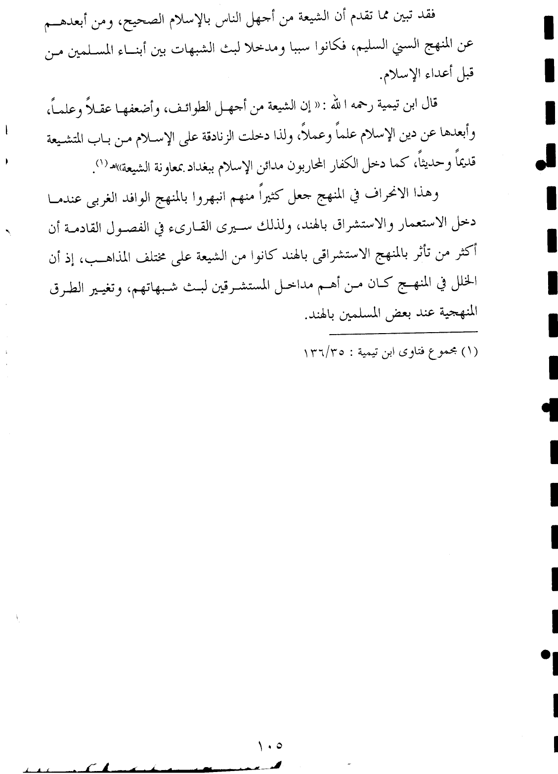 قال ابن تيمية رحمه الله: "إن الشيعة من أجهل الطوائف، وأضعفها عقلًا وعلمًا، وأبعدها عن دين الإسلام علمًا وعملًا، ولذا دخلت الزنادقة على الإسلام من باب المتشيعة قديمًا وحديثًا، كما دخل الكفار المحاربون مدائن الإسلام ببغداد بمعاونة الشيعة" اهـ (¬١).