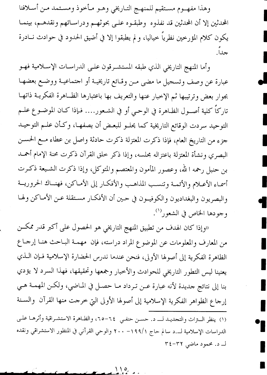 وأما المنهج التاريخي الذي طبقه المستشرقون على الدراسات الإسلامية فهو عبارة عن وصف وتسجيل ما مضى من وقائع تاريخية أو اجتماعية ووضع بعضها بجوار بعض وترتيبها ثم الإخبار عنها والتعريف بها باعتبارها الظاهرة الفكرية ذاتها تاركًا كلية أصول الظاهرة في الوحي أو في الشعور .... فإذا كان الموضوع علم التوحيد سردت الوقائع التاريخية كما يحلو للبعض أن يصفها، وكأن علم التوحيد جزء من التاريخ العام، فإذا ذكرت المعتزلة ذكرت حادثة واصل بن عطاء مع الحسن البصري ونشأة المعتزلة باعتزاله مجلسه، وإذا ذكر خلق القرآن ذكرت محنة الإمام أحمد بن حنبل رحمه الله، وعصور المأمون والمعتصم والمتوكل، وإذا ذكرت الشيعة ذكرت أسماء الأعلام والأئمة وتنسب المذاهب والأفكار إلى الأماكن، فهناك الحرورية والبصريون والبغداديون والكوفيون في حين أن الأفكار مستقلة عن الأماكن ولها وجودها الخاص في الشعور (¬١).