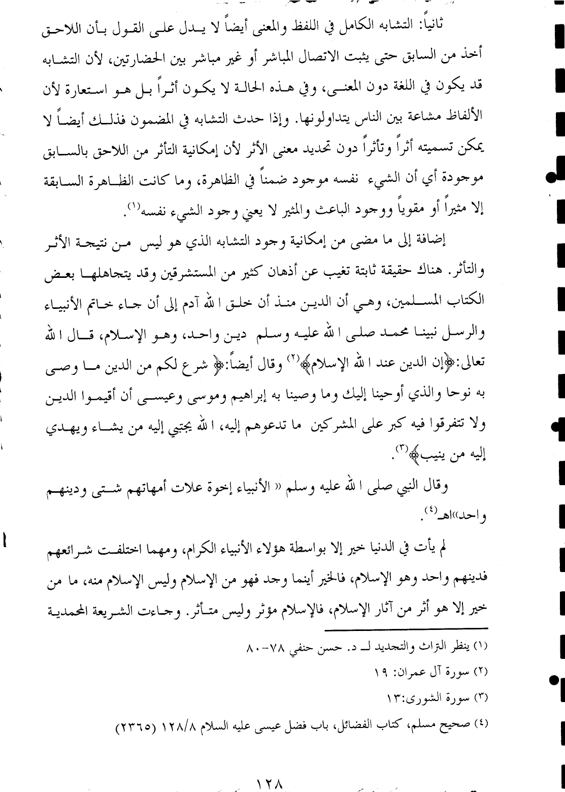 إضافة إلى ما مضى من إمكانية وجود التشابه الذي هو ليس من نتيجة الأثر والتأثر. هناك حقيقة ثابتة تغيب عن أذهان كثير من المستشرقين وقد يتجاهلها بعض الكتاب المسلمين، وهي أن الدين منذ أن خلق الله آدم إلى أن جاء خاتم الأنبياء والرسل نبينا محمد صلى الله عليه وسلم دين واحد، وهو الإسلام، قال الله تعالى: {إِنَّ الدِّينَ عِنْدَ اللَّهِ الْإِسْلَامُ} (¬٢) وقال أيضًا: {شَرَعَ لَكُمْ مِنَ الدِّينِ مَا وَصَّى بِهِ نُوحًا وَالَّذِي أَوْحَيْنَا إِلَيْكَ وَمَا وَصَّيْنَا بِهِ إِبْرَاهِيمَ وَمُوسَى وَعِيسَى أَنْ أَقِيمُوا الدِّينَ وَلَا تَتَفَرَّقُوا فِيهِ كَبُرَ عَلَى الْمُشْرِكِينَ مَا تَدْعُوهُمْ إِلَيْهِ اللَّهُ يَجْتَبِي إِلَيْهِ مَنْ يَشَاءُ وَيَهْدِي إِلَيْهِ مَنْ يُنِيبُ} (¬٣).