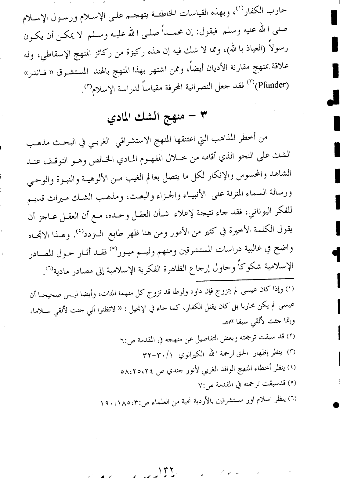 حارب الكفار (¬١)، وبهذه القياسات الخاطئة يتهجم على الإسلام ورسول الإسلام صلى الله عليه وسلم فيقول: إن محمدًا صلى الله عليه وسلم لا يمكن أن يكون رسولًا (العياذ بالله)، ومما لا شك فيه إن هذه ركيزة من ركائز المنهج الإسقاطي، وله علاقة بمنهج مقارنة الأديان أيضًا، وممن اشتهر بهذا المنهج بالهند المستشرق "فاندر" (Pfunder) (¬٢) فقد جعل النصرانية المحرفة مقياسًا لدراسة الإسلام (¬٣).
