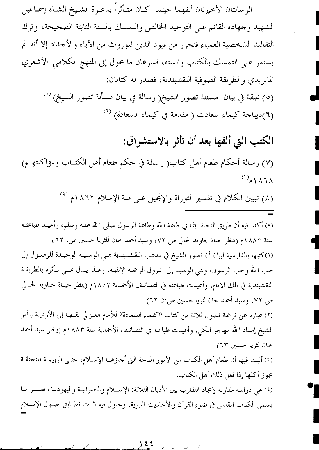 (¬١) كتبها بالفارسية لبيان أن تصور الشيخ في مذهب النقشبندية هي الوسيلة الوحيدة للوصول إلى حب الله وحب الرسول، وهي الوسيلة إلى نزول الرحمة الإلهية، وهذا يدل على تأثره بالطريقة النقشبندية في تلك الأيام، وأعيدت طباعته في التصانيف الأحمدية ١٨٥٢ م (ينظر حياة جاويد لحالي ص ٧٢، وسيد أحمد خان لثريا حسين ص: ن ٦٢).