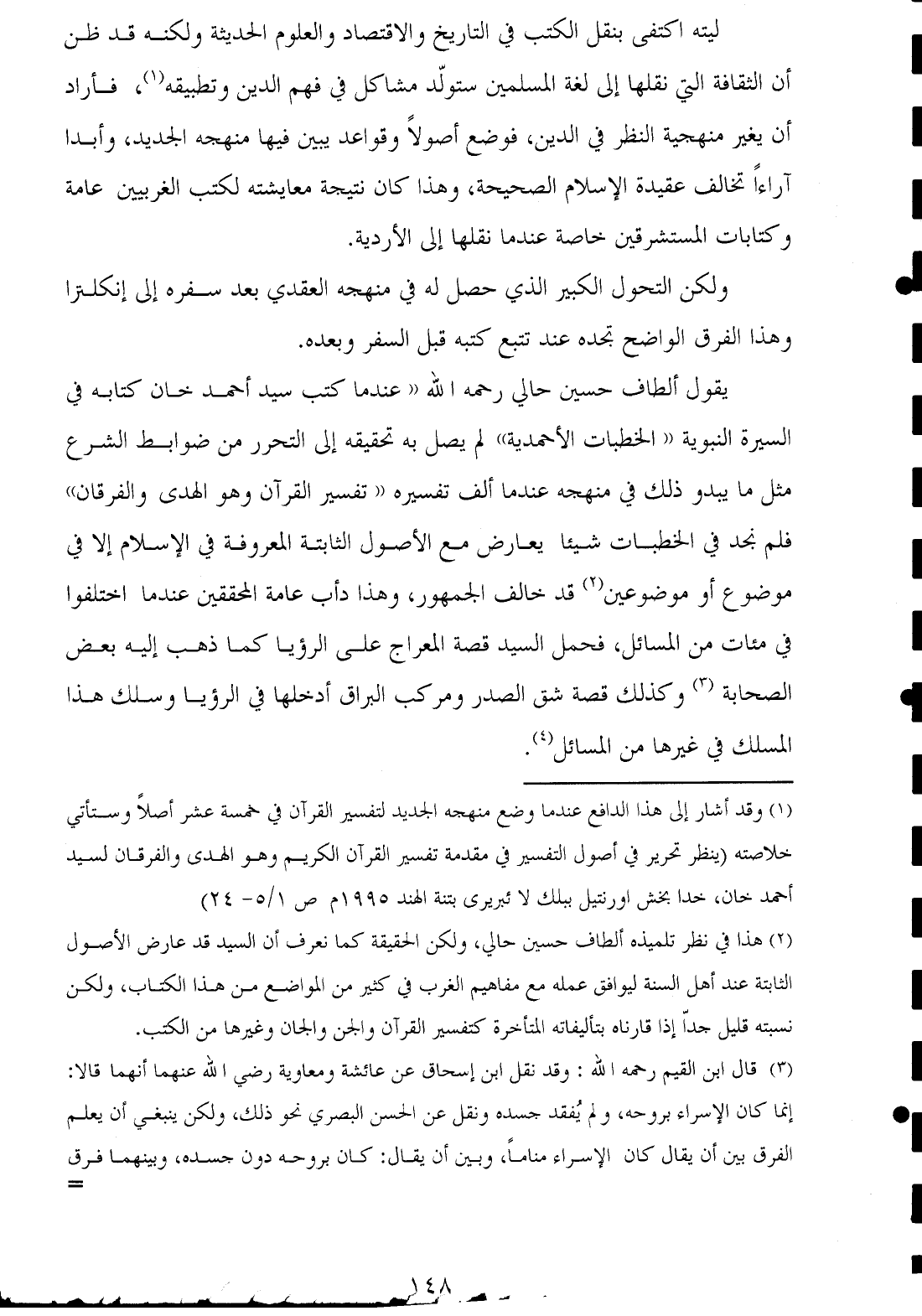 (¬٢) هذا في نظر تلميذه ألطاف حسين حالي، ولكن الحقيقة كما نعرف أن السيد قد عارض الأصول الثابتة عند أهل السنة ليوافق عمله مع مفاهيم الغرب في كثير من المواضع من هذا الكتاب، ولكن نسبته قليل جدًا إذا قارناه بتأليفاته المتأخرة كتفسير القرآن والجن والجان وغيرها من الكتب.