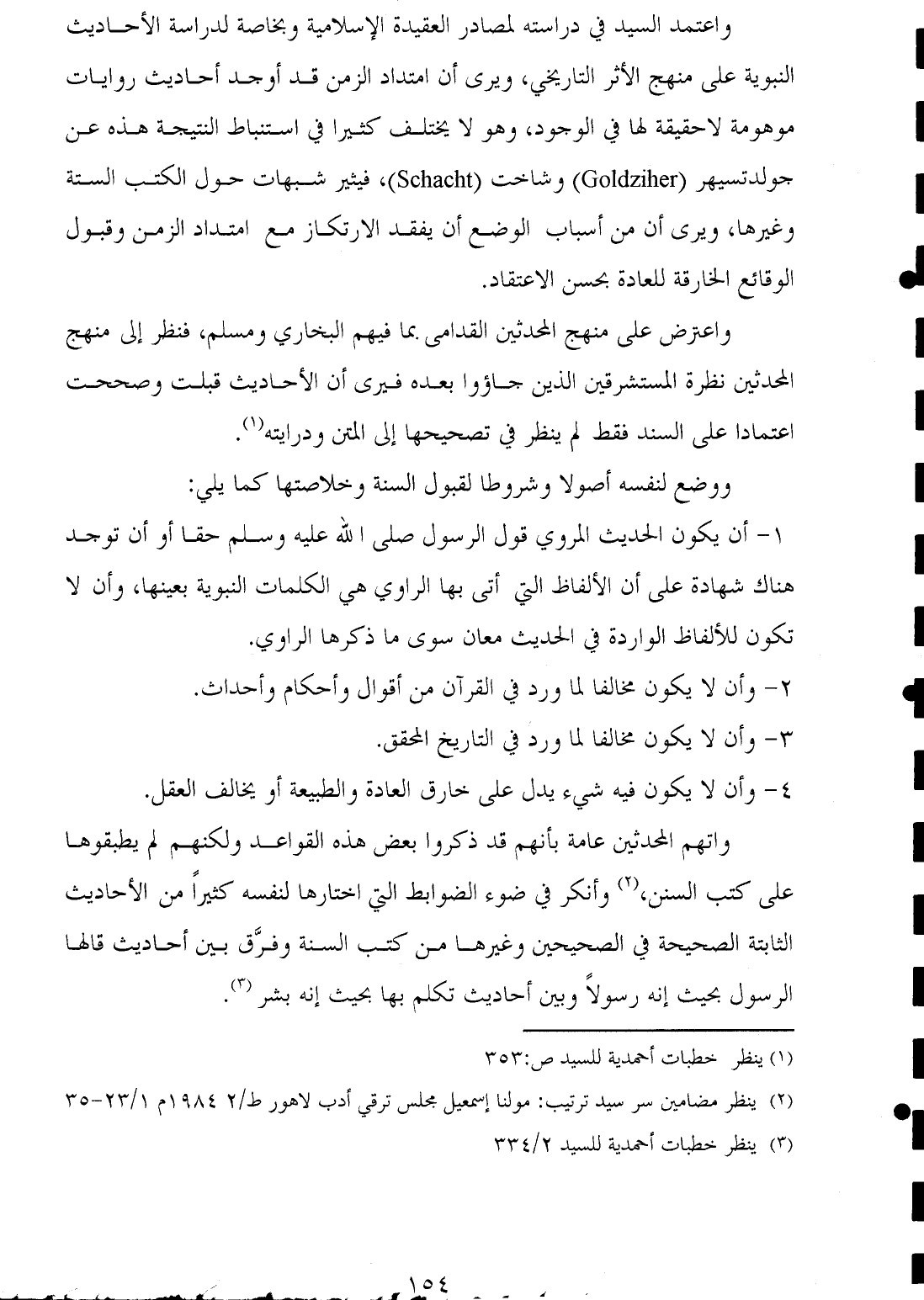 واتهم المحدثين عامة بأنهم قد ذكروا بعض هذه القواعد ولكنهم لم يطبقوها على كتب السنن، (¬٢) وأنكر في ضوء الضوابط التي اختارها لنفسه كثيرًا من الأحاديث الثابتة الصحيحة في الصحيحين وغيرها من كتب السنة وفرَّق بين أحاديث قالها الرسول بحيث إنه رسولًا وبين أحاديث تكلم بها بحيث إنه بشر (¬٣).