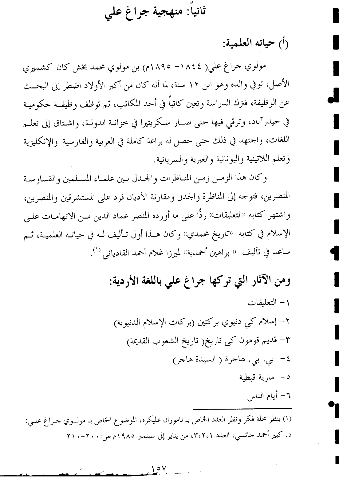 (¬١) ينظر مجلة فكر ونظر العدد الخاص بـ ناموران عليكره، الموضوع الخاص بـ مولوي جراغ علي: د. كبير أحمد جائسي، العدد ٣، ٢، ١، من يناير إلى سبتمبر ١٩٨٥ م ص: ٢٠٠ - ٢١٠.