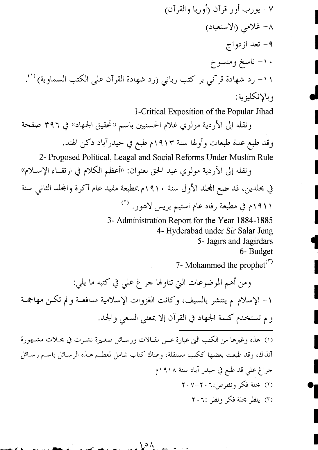 (¬١) هذه وغيرها من الكتب التي عبارة عن مقالات ورسائل صغيرة نشرت في مجلات مشهورة آنذاك، وقد طبعت بعضها ككتب مستقلة، وهناك كتاب شامل لمعظم هذه الرسائل باسم رسائل جراغ علي قد طبع في حيدر آباد سنة ١٩١٨ م.