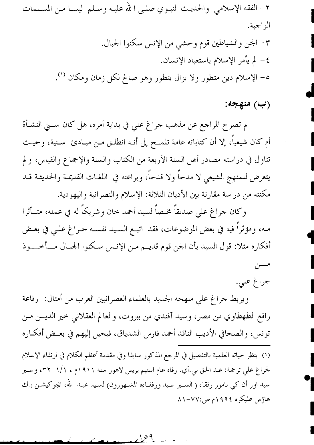 ويربط جراغ علي منهجه الجديد بالعلماء العصرانيين العرب من أمثال: رفاعة رافع الطهطاوي من مصر، وسيد آفندي من بيروت، والعالم العقلاني خير الدين من تونس، والصحافي الأديب الناقد أحمد فارس الشدياق، فيحيل إليهم في بعض أفكاره