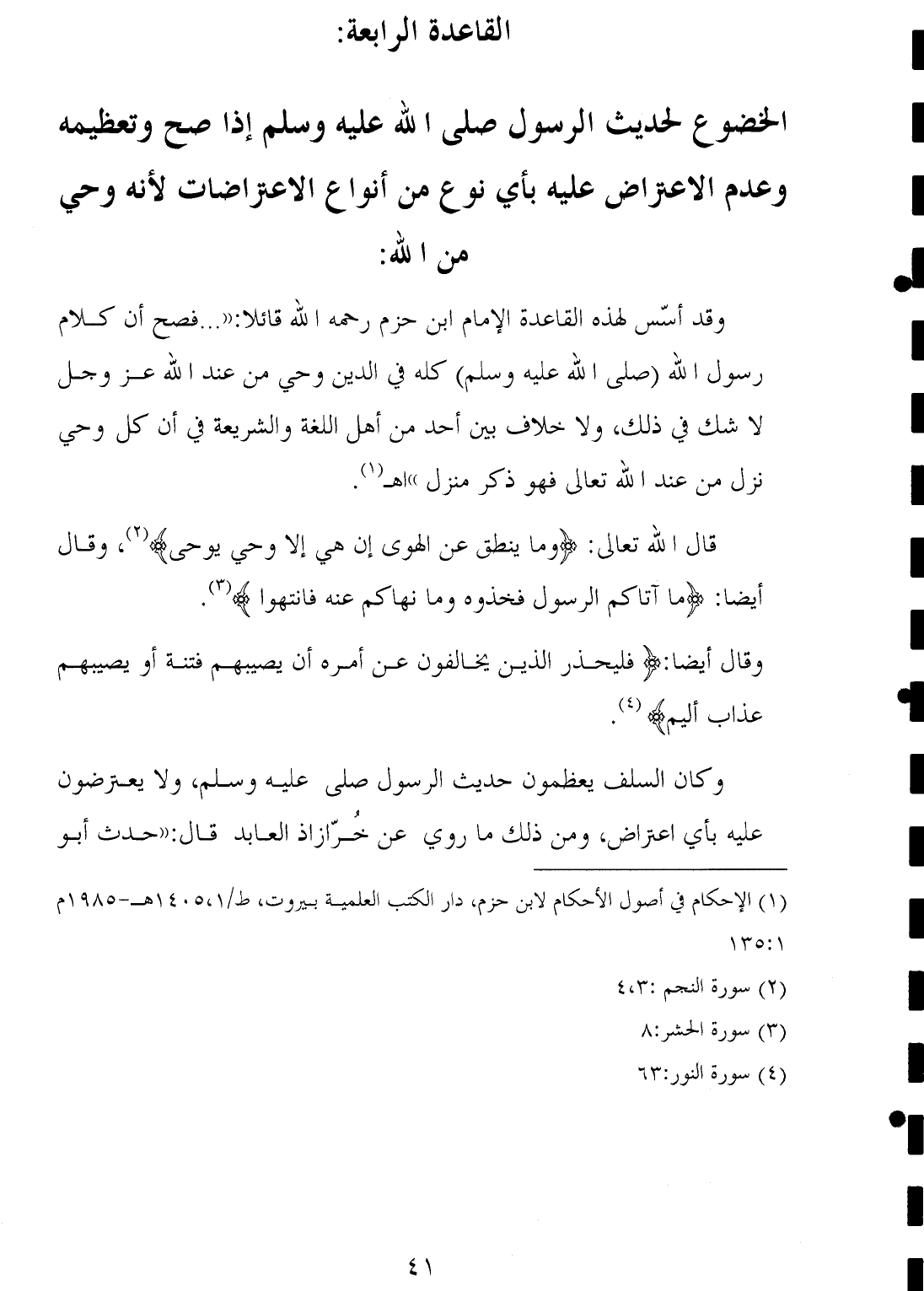 القاعدة الرابعة: الخضوع لحديث الرسول صلى الله عليه وسلم إذا صح وتعظيمه وعدم الاعتراض عليه بأي نوع من أنواع الاعتراضات لأنه وحي من الله:
