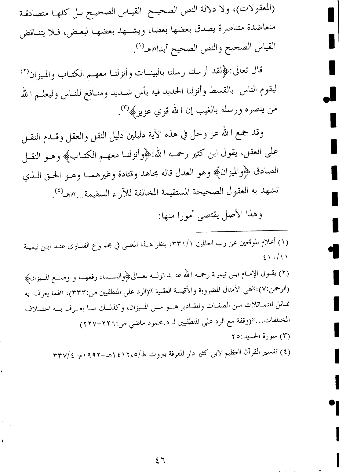 (¬٢) يقول الإمام ابن تيمية رحمه الله عند قوله تعالى {وَالسَّمَاءَ رَفَعَهَا وَوَضَعَ الْمِيزَانَ} (الرحمن: ٧): "هي الأمثال المضروبة والأقيسة العقلية" (الرد على المنطقيين ص: ٣٣٣)، "فما يعرف به تماثل المتماثلات من الصفات والمقادير هو من الميزان، وكذلك ما يعرف به اختلاف المختلفات ... " (وقفة مع الرد على المنطقيين لـ د. محمود ماضي ص: ٢٢٦ - ٢٢٧).