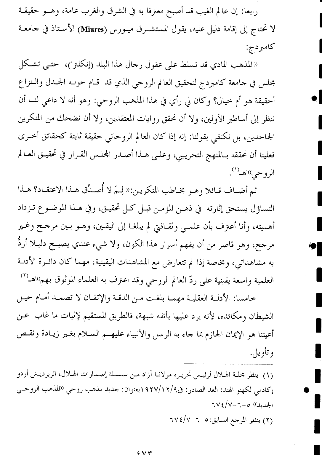 (¬١) ينظر مجلة الهلال لرئيس تحريره مولانا آزاد من سلسلة إصدارات الهلال، اتربرديش أردو إكادمي لكهنو الهند: العد الصادر: في ٩/ ١٩٢٧/١٢ بعنوان: جديد مذهب روحي "المذهب الروحي الجديد" ٥ - ٦ - ٧/ ٦٧٤.