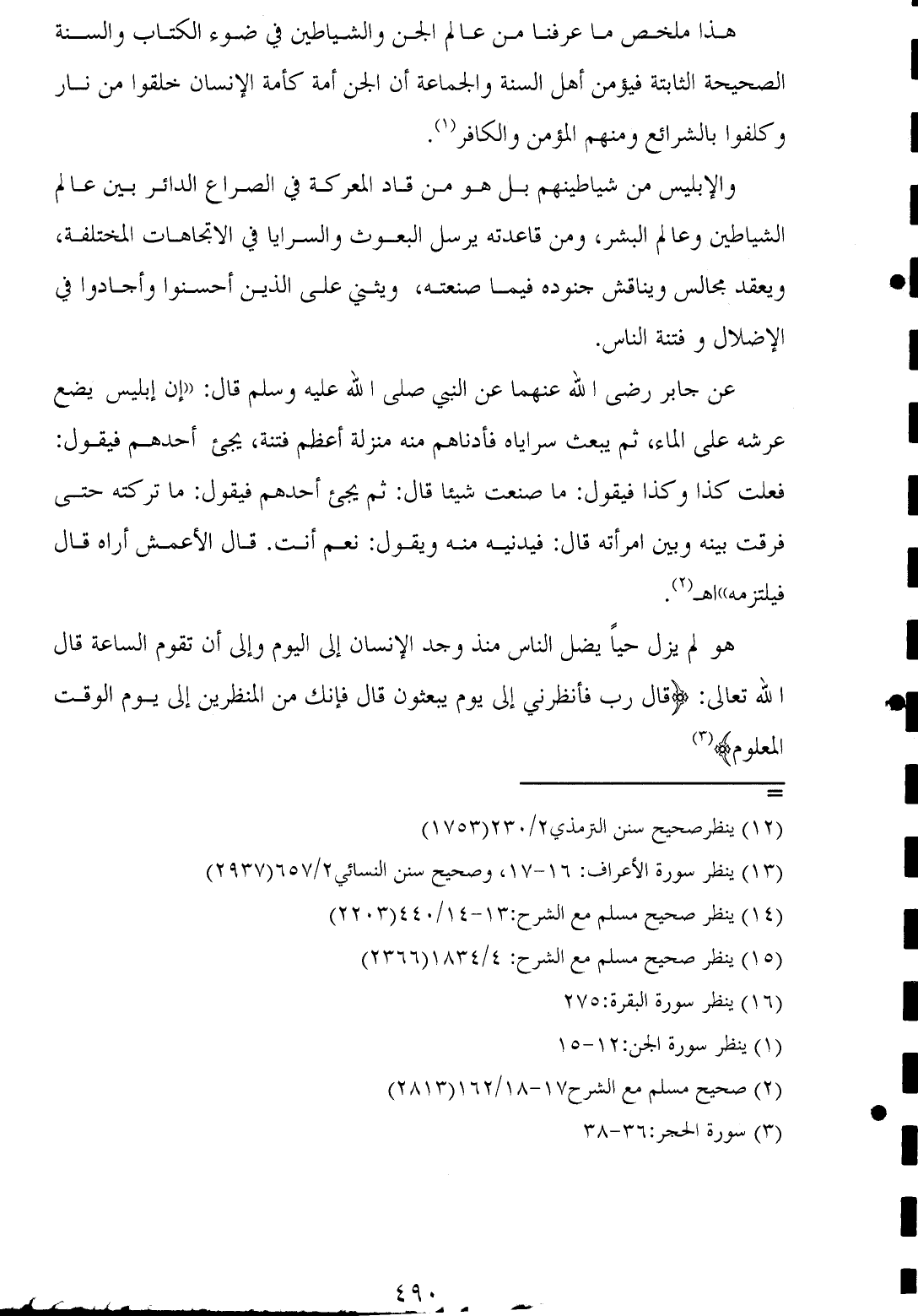 هذا ملخص ما عرفنا من عالم الجن والشياطين في ضوء الكتاب والسنة الصحيحة الثابتة فيؤمن أهل السنة والجماعة أن الجن أمة كأمة الإنسان خلقوا من نار وكلفوا بالشرائع ومنهم المؤمن والكافر (¬١).