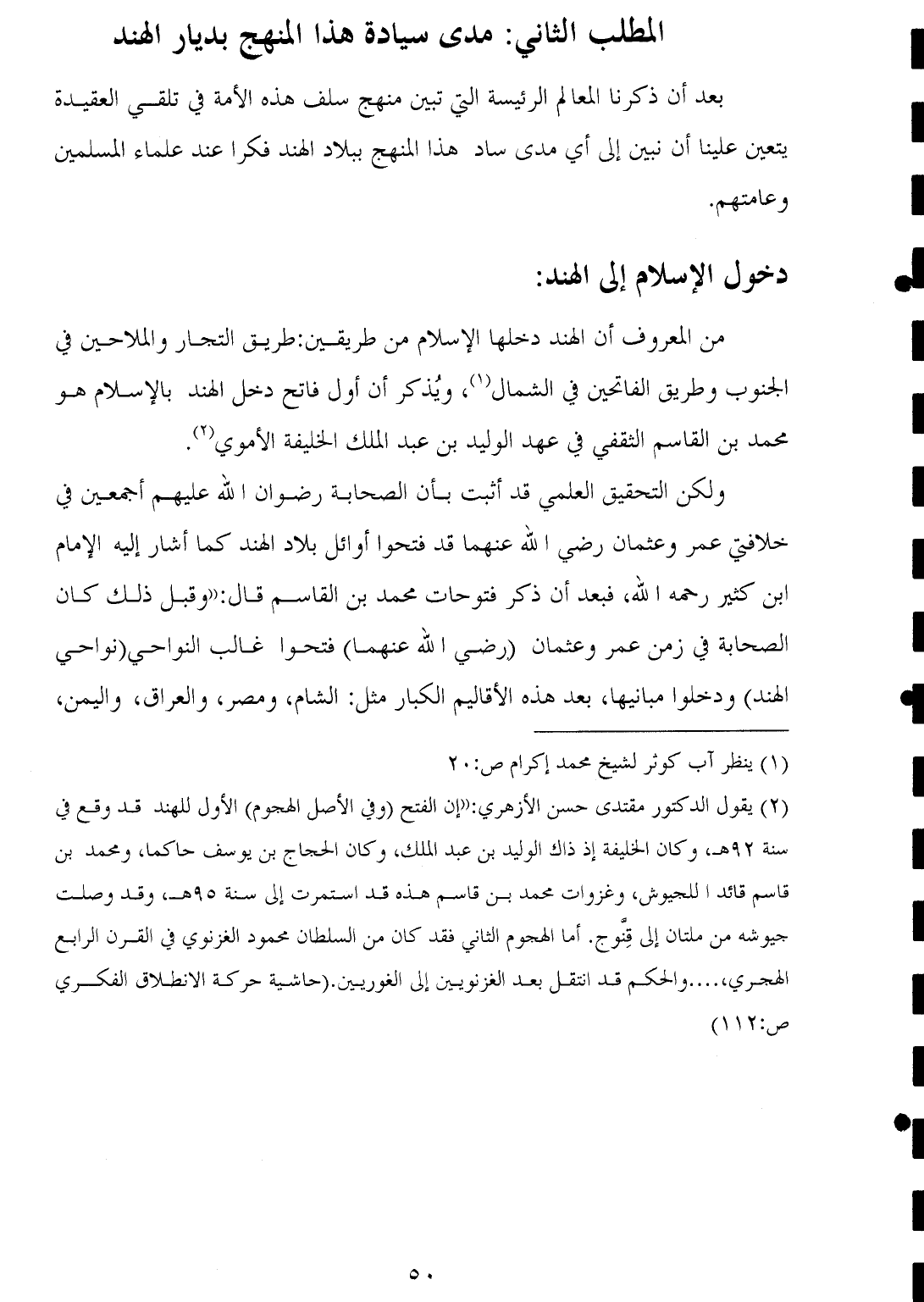 (¬٢) يقول الدكتور مقتدى حسن الأزهري: "إن الفتح (وفي الأصل الهجوم) الأول للهند قد وقع في سنة ٩٢ هـ، وكان الخليفة إذ ذاك الوليد بن عبد الملك، وكان الحجاج بن يوسف حاكما، ومحمد بن قاسم قائدا للجيوش، وغزوات محمد بن قاسم هذه قد استمرت إلى سنة ٩٥ هـ، وقد وصلت جيوشه من ملتان إلى قِنَّوج. أما الهجوم الثاني فقد كان من السلطان محمود الغزنوي في القرن الرابع الهجري، .... والحكم قد انتقل بعد الغزنويين إلى الغوريين. (حاشية حركة الانطلاق الفكري ص: ١١٢).