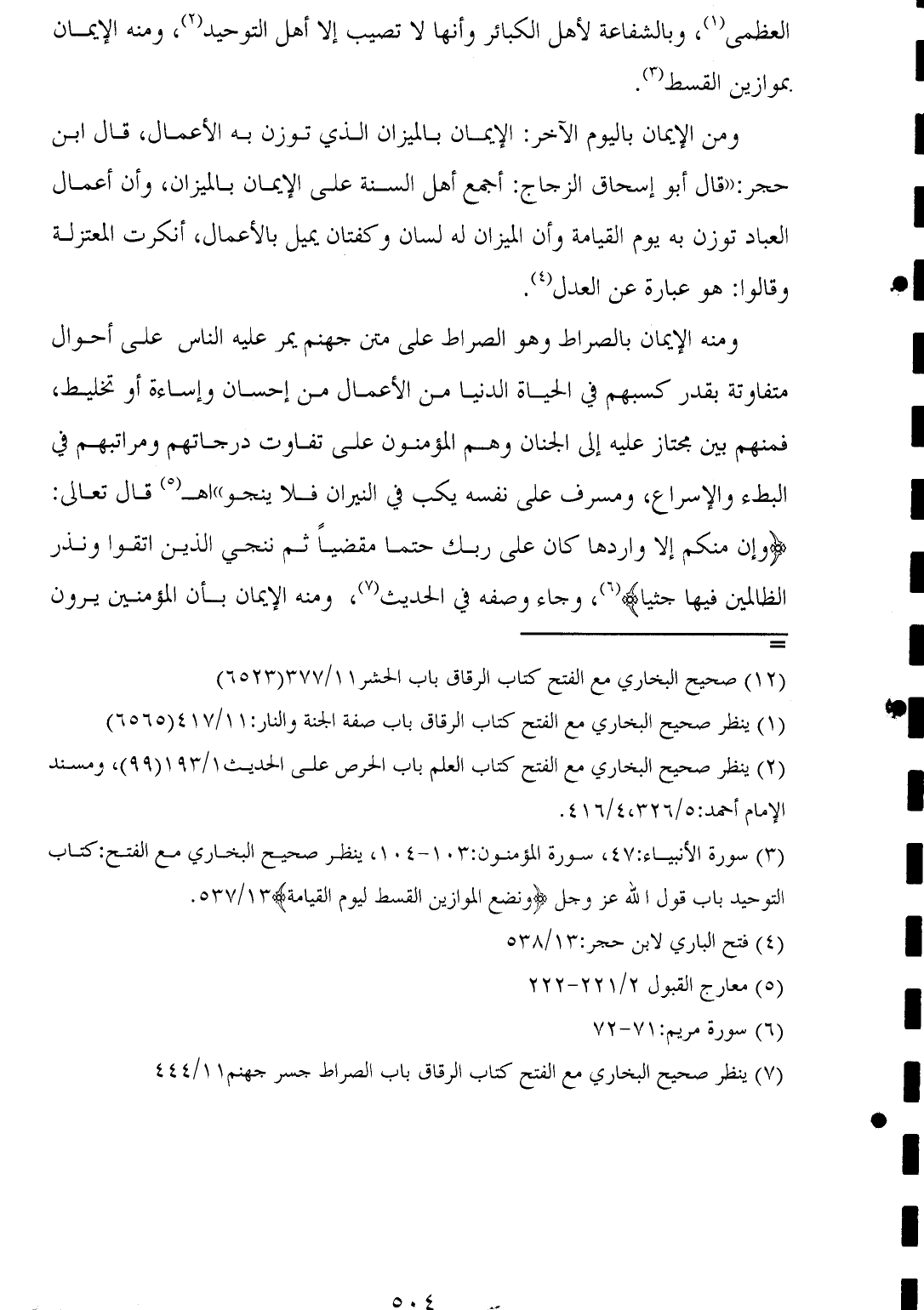 (¬٣) سورة الأنبياء: ٤٧، سورة المؤمنون: ١٠٣ - ١٠٤، ينظر صحيح البخاري مع الفتح: كتاب التوحيد باب قول الله عز وجل {وَنَضَعُ الْمَوَازِينَ الْقِسْطَ لِيَوْمِ الْقِيَامَةِ} ١٣/ ٥٣٧.