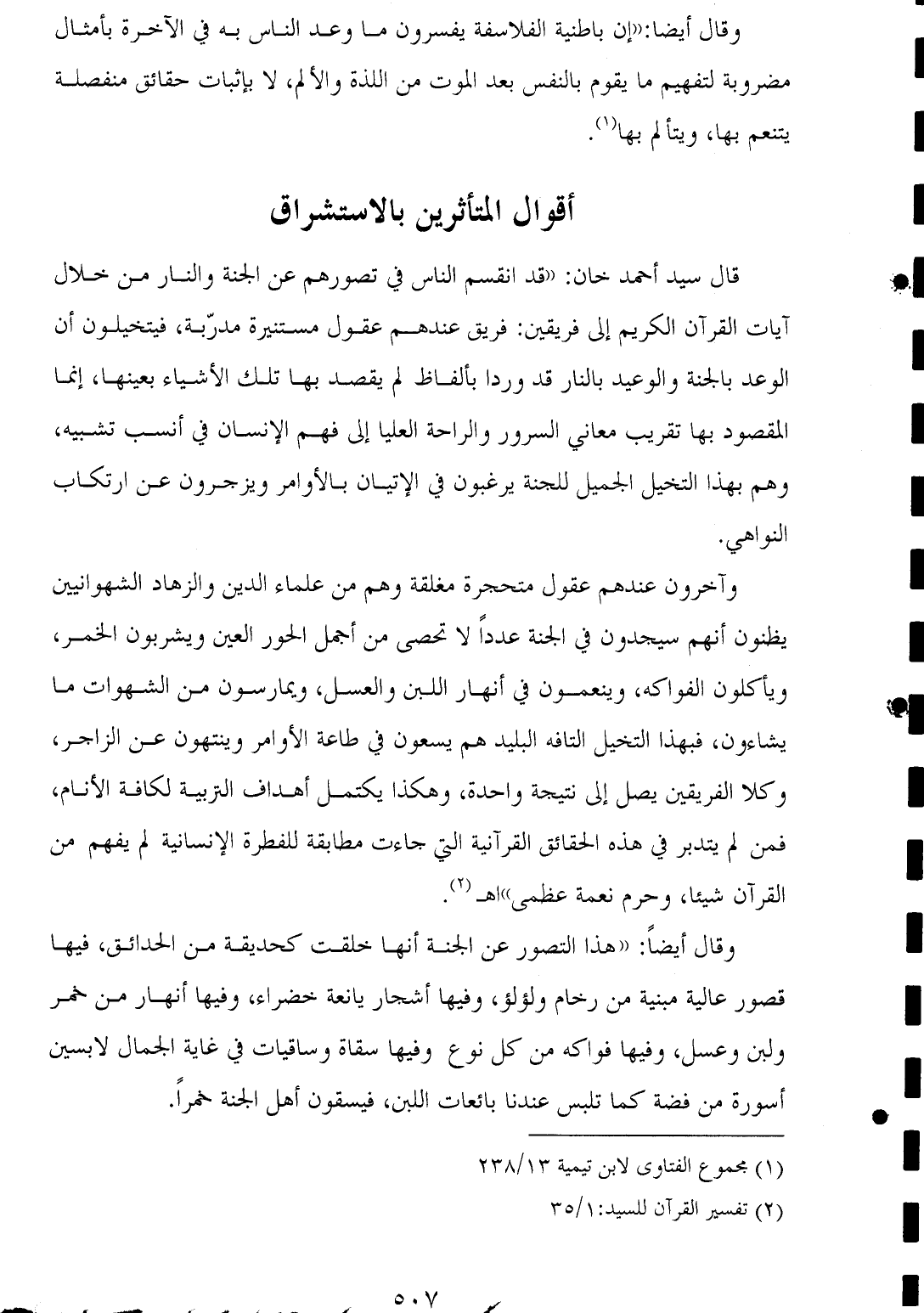 قال سيد أحمد خان: "قد انقسم الناس في تصورهم عن الجنة والنار من خلال آيات القرآن الكريم إلى فريقين: فريق عندهم عقول مستنيرة مدرّبة، فيتخيلون أن الوعد بالجنة والوعيد بالنار قد وردا بألفاظ لم يقصد بها تلك الأشياء بعينها، إنما المقصود بها تقريب معاني السرور والراحة العليا إلى فهم الإنسان في أنسب تشبيه، وهم بهذا التخيل الجميل للجنة يرغبون في الإتيان بالأوامر ويزجرون عن أرتكاب النواهي.