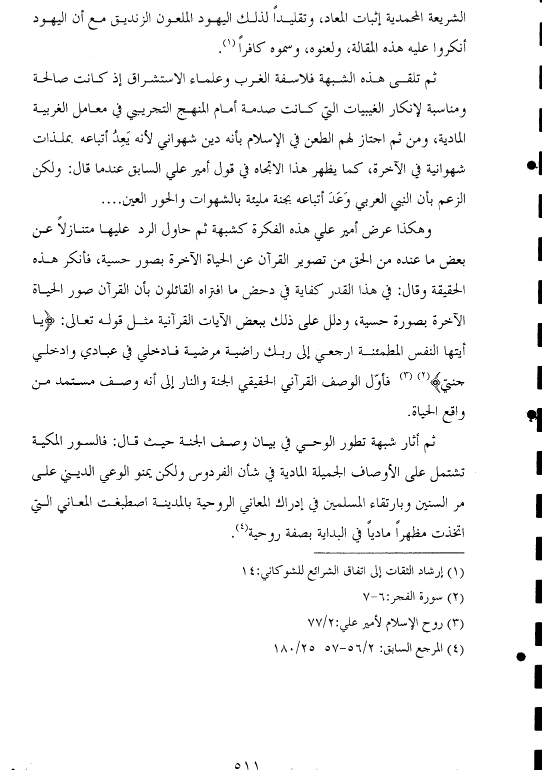 وهكذا عرض أمير علي هذه الفكرة كشبهة ثم حاول الرد عليها متنازلًا عن بعض ما عنده من الحق من تصوير القرآن عن الحياة الآخرة بصور حسية، فأنكر هذه الحقيقة وقال: في هذا القدر كفاية في دحض ما افتراه القائلون بأن القرآن صور الحياة الآخرة بصورة حسية، ودلل على ذلك ببعض الآيات القرآنية مثل قوله تعالى: {يَاأَيَّتُهَا النَّفْسُ الْمُطْمَئِنَّةُ (٢٧) ارْجِعِي إِلَى رَبِّكِ رَاضِيَةً مَرْضِيَّةً (٢٨) فَادْخُلِي فِي عِبَادِي (٢٩) وَادْخُلِي جَنَّتِي} (¬٢) (¬٣) فأوَّل الوصف القرآني الحقيقي الجنة والنار إلى أنه وصف مستمد من واقع الحياة.