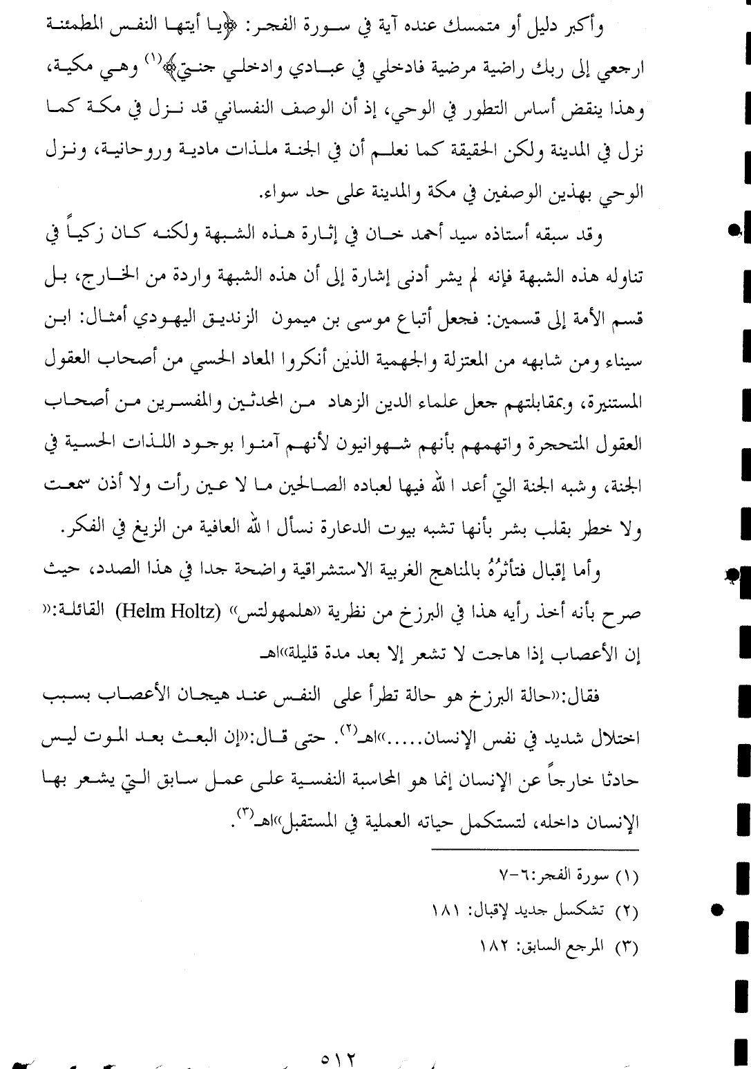 وأما إقبال فتأثرُهُ بالمناهج الغربية الاستشراقية واضحة جدا في هذا الصدد، حيث صرح بأنه أخذ رأيه هذا في البرزخ من نظرية "هلمهولتس" (Helm Holtz) القائلة: "إن الأعصاب إذا هاجت لا تشعر إلا بعد مدة قليلة" اهـ.
