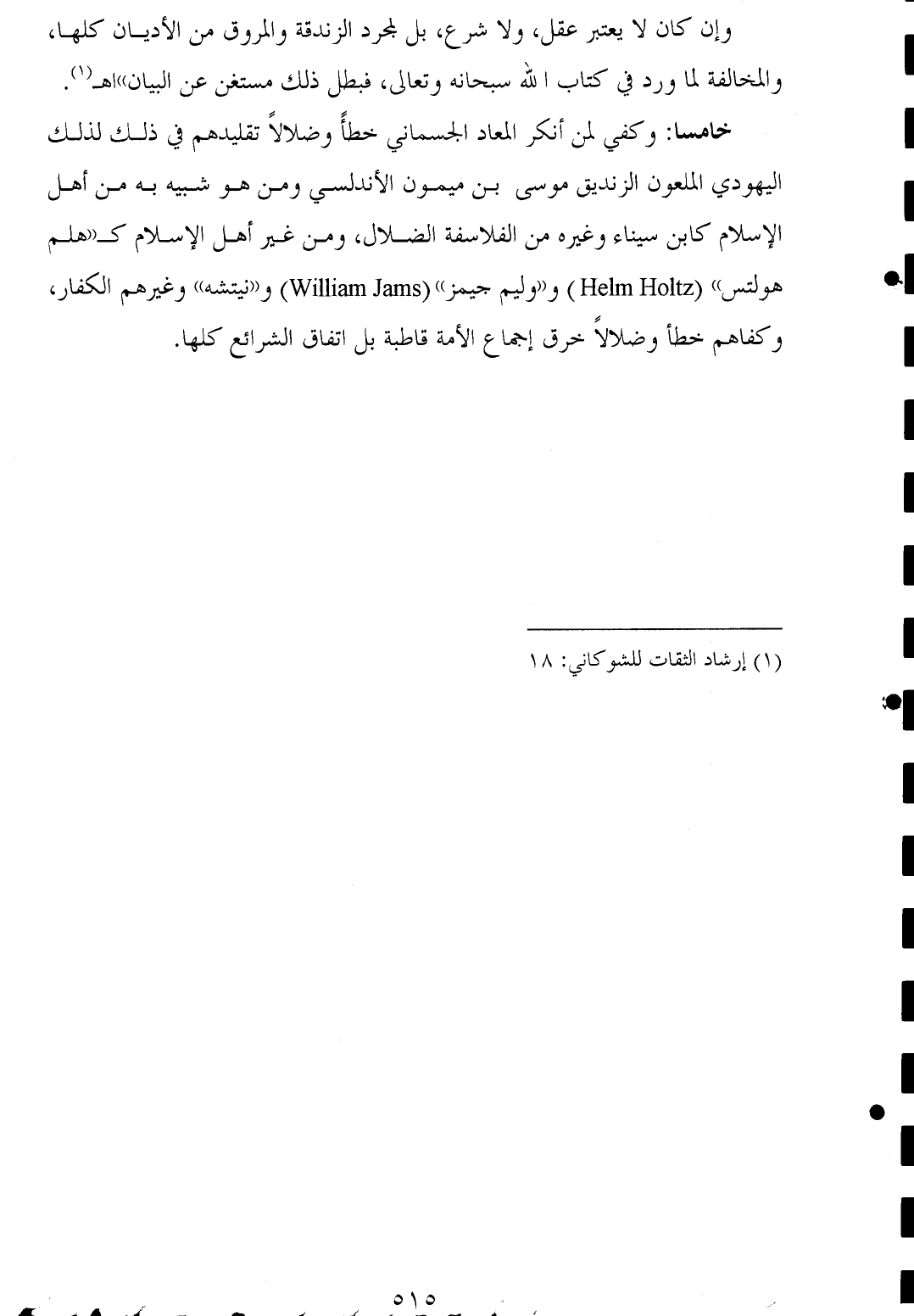 خامسا: وكفي لمن أنكر المعاد الجسماني خطأً وضلالًا تقليدهم في ذلك لذلك اليهودي الملعون الزنديق موسى بن ميمون الأندلسي ومن هو شبيه به من أهل الإسلام كابن سيناء وغيره من الفلاسفة الضلال، ومن غير أهل الإسلام كـ "هلم هولتس" (Helm Holtz) و"وليم جيمز" (William Jams) و"نيتشه" وغيرهم الكفار، وكفاهم خطأ وضلالًا خرق إجماع الأمة قاطبة بل اتفاق الشرائع كلها.