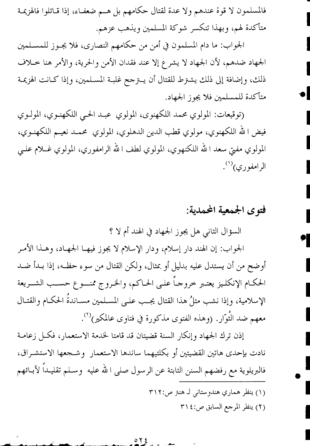 (توقيعات: المولوي محمد اللكهنوى، المولوي عبد الحي اللكهنوي، المولوي فيض الله اللكهنوي، مولوي قطب الدين الدهلوي، المولوي محمد نعيم اللكهنوي، المولوي مفتي سعد الله اللكنهوي، المولوي لطف الله الرامفوري، المولوي غلام علي الرامفوري) (¬١).