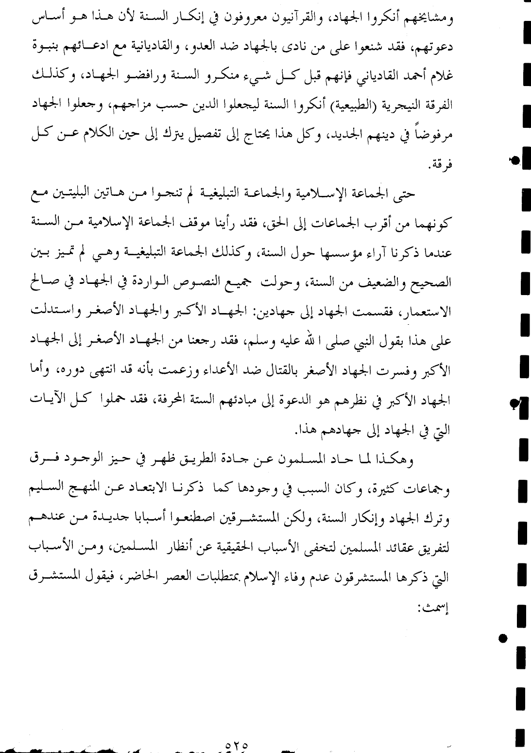ومشايخهم أنكروا الجهاد، والقرآنيون معروفون في إنكار السنة لأن هذا هو أساس دعوتهم، فقد شنعوا على من نادى بالجهاد ضد العدو، والقاديانية مع ادعائهم بنبوة غلام أحمد القادياني فإنهم قبل كل شيء منكرو السنة ورافضو الجهاد، وكذلك الفرقة النيجرية (الطبيعية) أنكروا السنة ليجعلوا الدين حسب مزاجهم، وجعلوا الجهاد مرفوضًا في دينهم الجديد، وكل هذا يحتاج إلى تفصيل يترك إلى حين الكلام عن كل فرقة.
