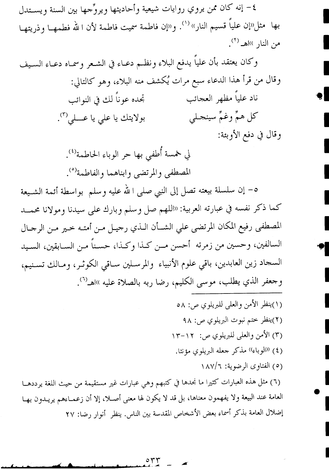 (¬٦) مثل هذه العبارات كثيرا ما نجدها في كتبهم وهي عبارات غير مستقيمة من حيث اللغة يرددها العامة عند البيعة ولا يفهمون معناها، بل قد لا يكون لها معنى أصلا، إلا أن زعماءهم يريدون بها إضلال العامة بذكر أسماء بعض الأشخاص المقدسة بين الناس. ينظر أنوار رضا: ٢٧.