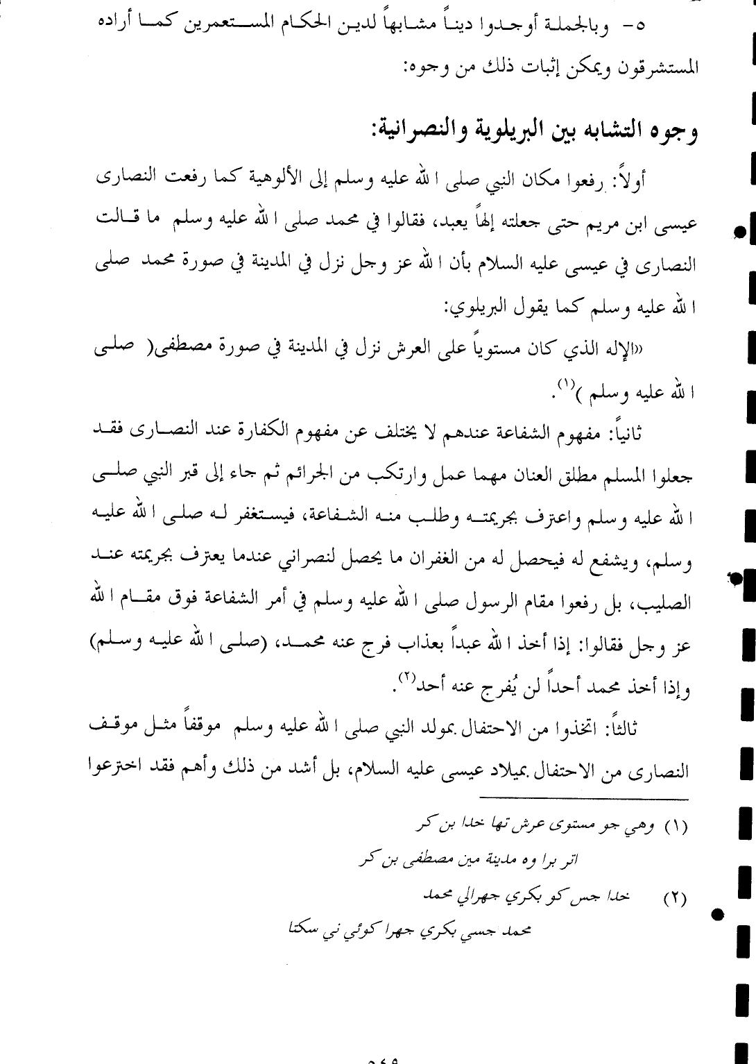 أولًا: رفعوا مكان النبي صلى الله عليه وسلم إلى الألوهية كما رفعت النصارى عيسى ابن مريم حتى جعلته إلهًا يعبد، فقالوا في محمد صلى الله عليه وسلم ما قالت النصارى في عيسى عليه السلام بأن الله عز وجل نزل في المدينة في صورة محمد صلى الله عليه وسلم كما يقول البريلوي: