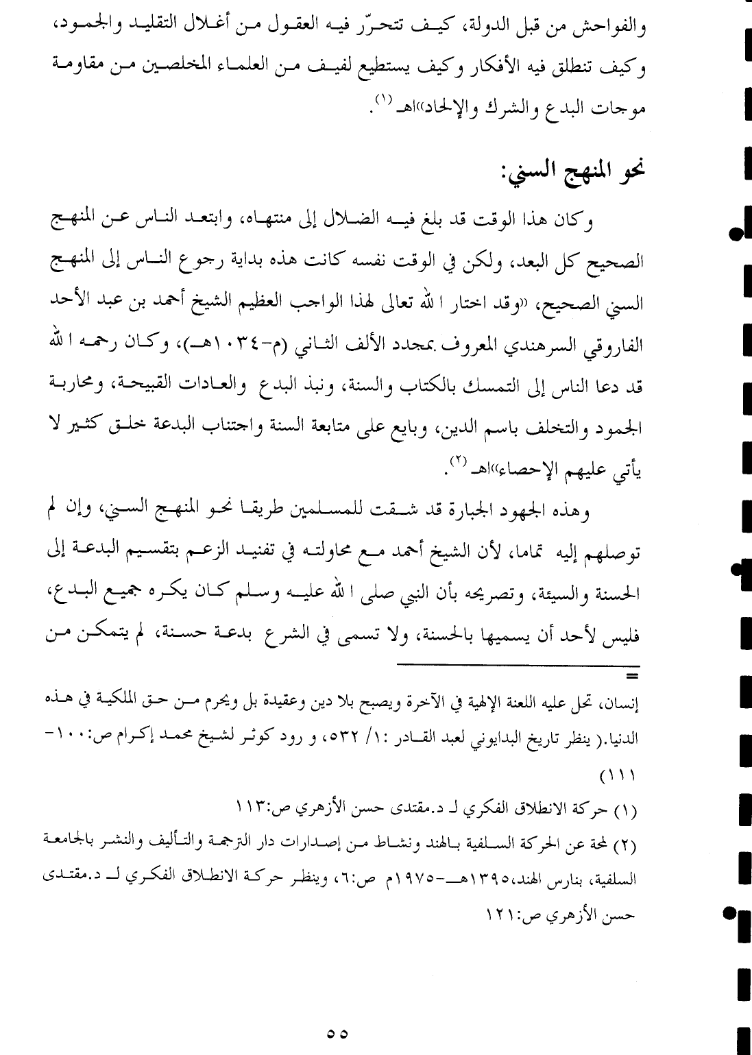 والفواحش من قبل الدولة، كيف تتحرّر فيه العقول من أغلال التقليد والجمود، وكيف تنطلق فيه الأفكار وكيف يستطيع لفيف من العلماء المخلصين من مقاومة موجات البدع والشرك والإلحاد" اهـ (¬١).