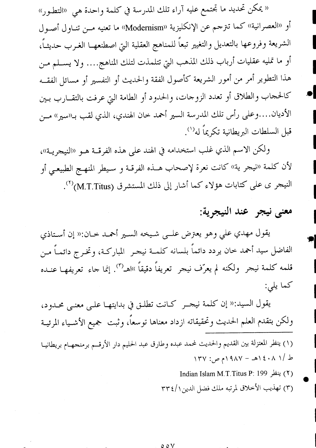 "يمكن تحديد ما تجتمع عليه آراء تلك المدرسة في كلمة واحدة هي "التطور" أو "العصرانية" كما تترجم عن الإنكليزية " Modernism" ما تعنيه من تناول أصول الشريعة وفروعها بالتعديل والتغيير تبعًا للمناهج العقلية التي اصطنعها الغرب حديثًا، أو ما تمليه عقليات أرباب ذلك المذهب التي تتلمذت لتلك المناهج .... ولا يسلم من هذا التطوير أمر من أمور الشريعة كأصول الفقة والحديث أو التفسير أو مسائل الفقه كالحجاب والطلاق أو تعدد الزوجات، والحدود أو الطامة التي عرفت بالتقارب بين الأديان .... وعلى رأس تلك المدرسة السير أحمد خان الهندي، الذي لقب بـ "سير" من قبل السلطات البريطانية تكريمًا له (¬١).