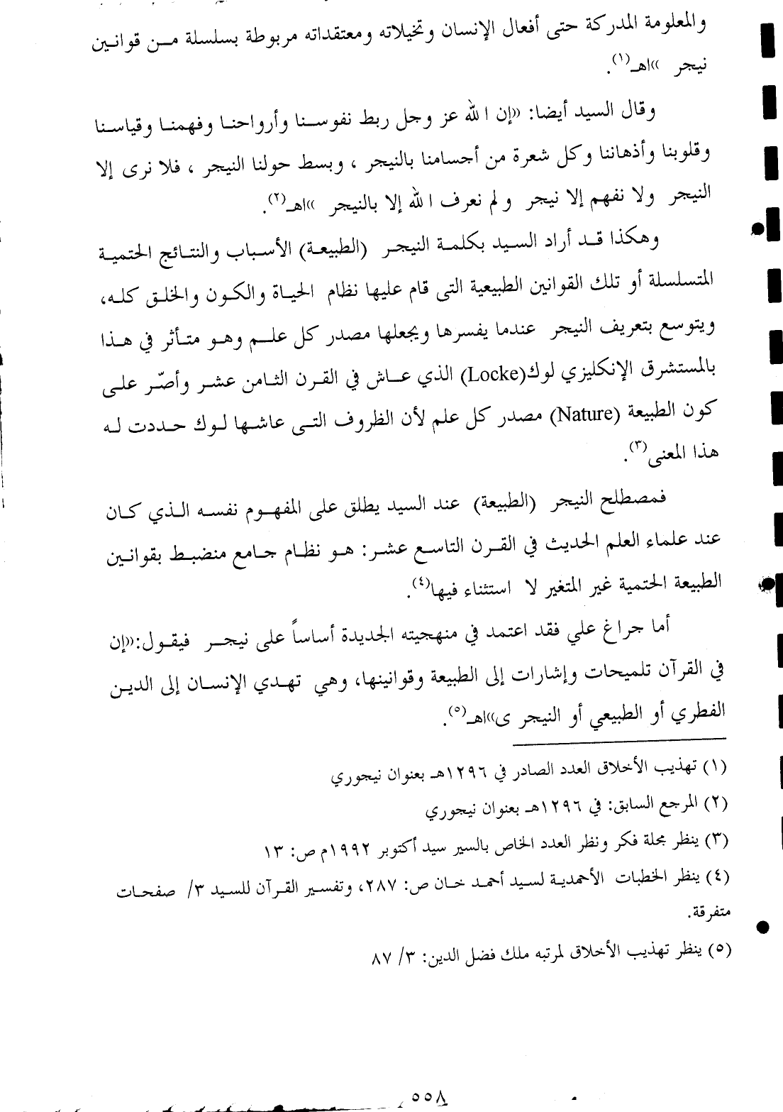 وهكذا قد أراد السيد بكلمة النيجر (الطبيعة) الأسباب والنتائج الحتمية المتسلسلة أو تلك القوانين الطبيعية التى قام عليها نظام الحياة والكون والخلق كله، ويتوسع بتعريف النيجر عندما يفسرها ويجعلها مصدر كل علم وهو متأثر في هذا بالمستشرق الإنكليزي لوك (Locke) الذي عاش في القرن الثامن عشر وأصّر على كون الطبيعة (Nature) مصدر كل علم لأن الظروف التى عاشها لوك حددت له هذا المعنى (¬٣).