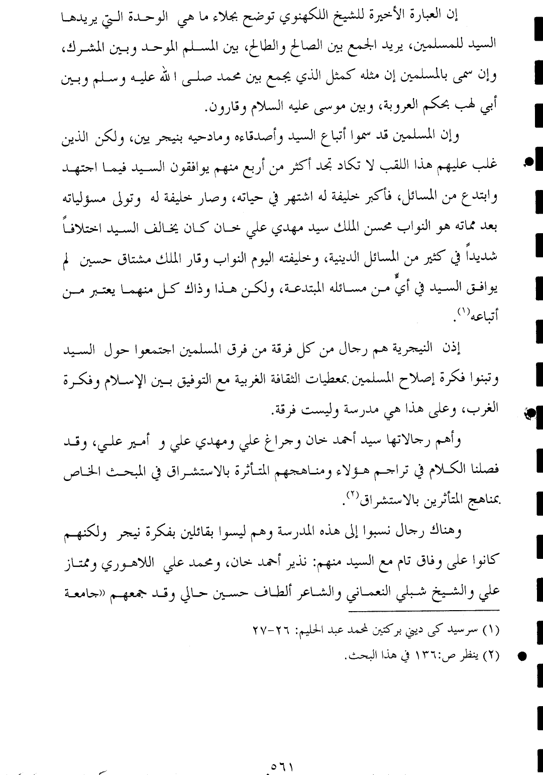 وأهم رجالاتها سيد أحمد خان وجراغ علي ومهدي علي وأمير علي، وقد فصلنا الكلام في تراجم هؤلاء ومناهجهم المتأثرة بالاستشراق في المبحث الخاص بمناهج المتأثرين بالاستشراق (¬٢).
