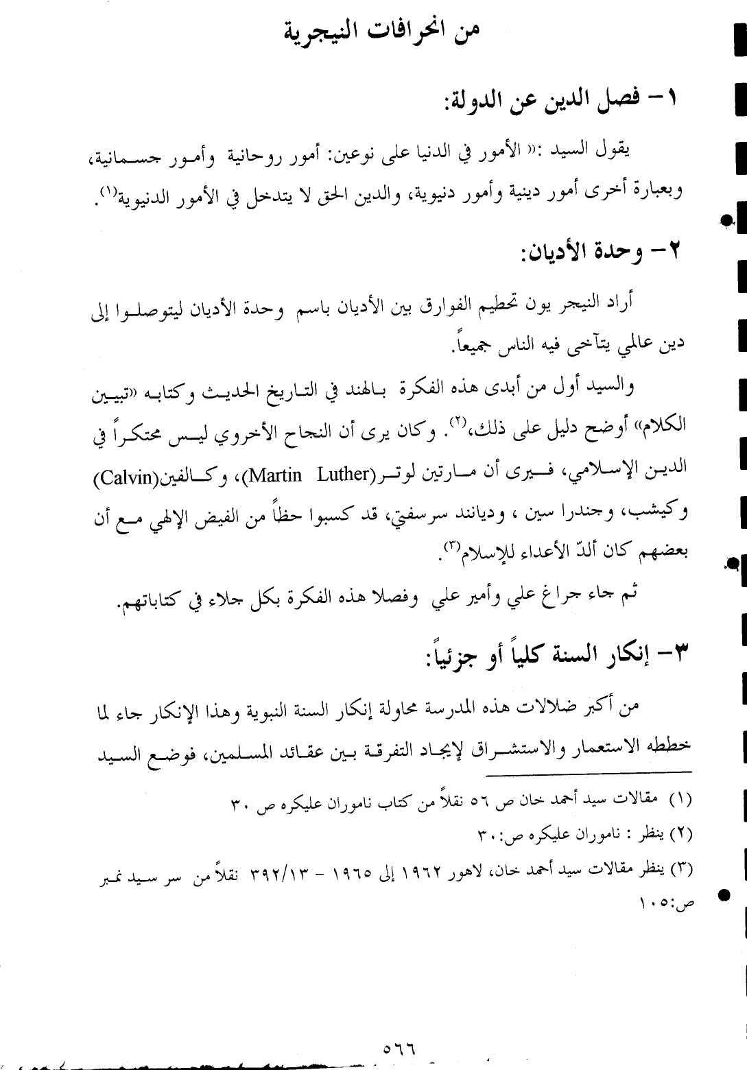 والسيد أول من أبدى هذه الفكرة بالهند في التاريخ الحديث وكتابه "تبيين الكلام" أوضح دليل على ذلك، (¬٢). وكان يرى أن النجاح الأخروي ليس محتكرًا في الدين الإسلامي، فيرى أن مارتين لوتر (Martin Luther)، وكالفين (Calvin) وكيشب، وجندرا سين، وديانند سرسفتي، قد كسبوا حظًا من الفيض الإلهي مع أن بعضهم كان ألدّ الأعداء للإسلام (¬٣).