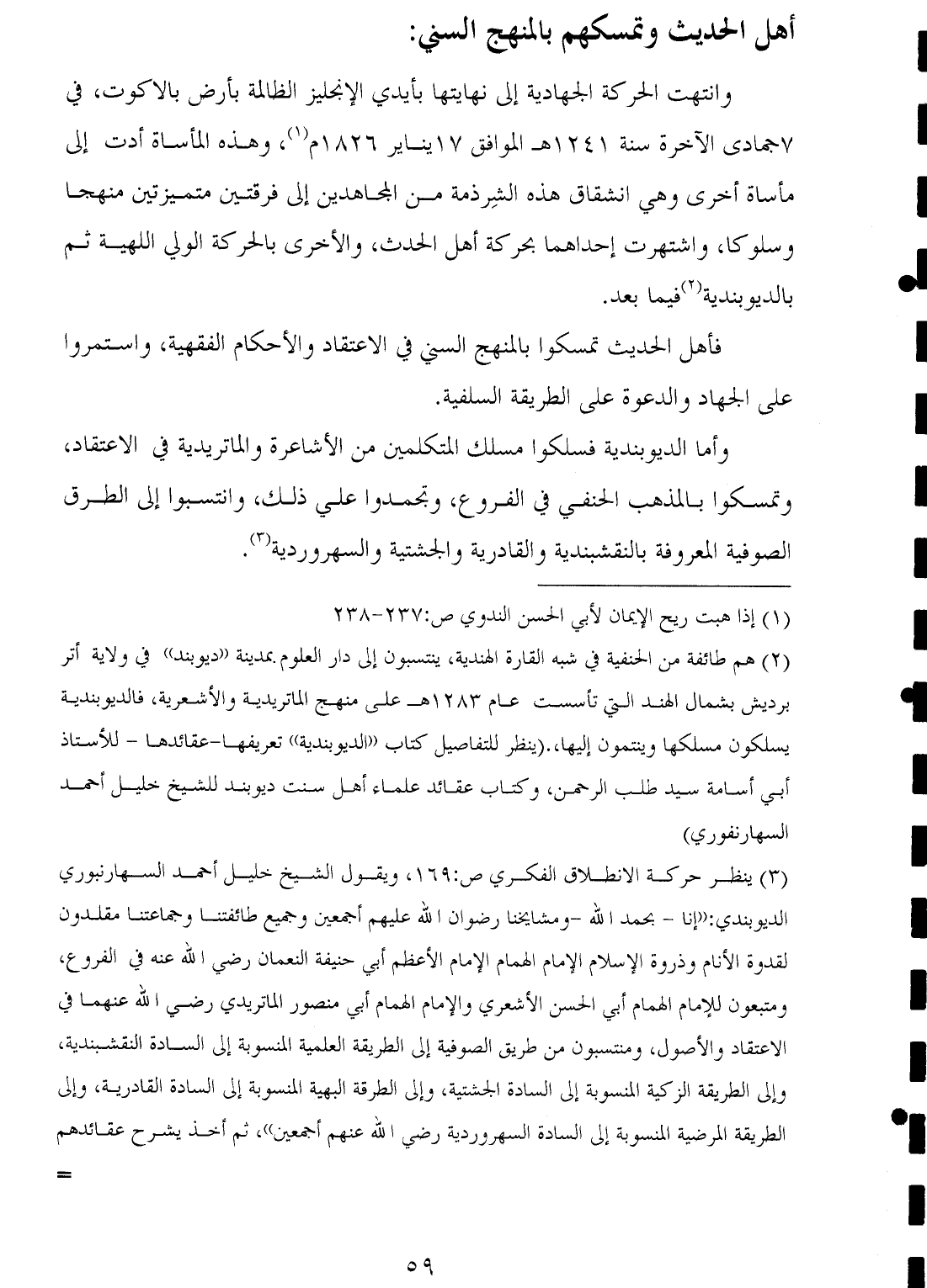 (¬٣) ينظر حركة الانطلاق الفكري ص: ١٦٩، ويقول الشيخ خليل أحمد السهارنبوري الديوبندي: "إنا -بحمد الله- ومشايخنا رضوان الله عليهم أجمعين وجميع طائفتنا وجماعتنا مقلدون لقدوة الأنام وذروة الإسلام الإمام الهمام الإمام الأعظم أبي حنيفة النعمان رضي الله عنه في الفروع، ومتبعون للإمام الهمام أبي الحسن الأشعري والإمام الهمام أبي منصور الماتريدي رضي الله عنهما في الاعتقاد والأصول، ومنتسبون من طريق الصوفية إلى الطريقة العلمية المنسوبة إلى السادة النقشبندية، وإلى الطريقة الزكية المنسوبة إلى السادة الجشتية، وإلى الطرقة البهية المنسوبة إلى السادة القادرية، وإلى الطريقة المرضية المنسوبة إلى السادة السهروردية رضي الله عنهم أجمعين"، ثم أخذ يشرح عقائدهم =
