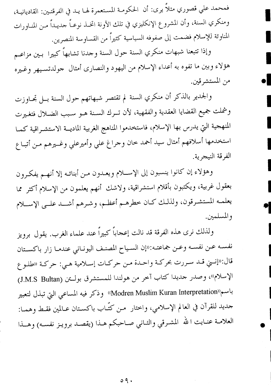 فمحمد علي قصوري مثلًا يرى: أن الحكومة المستعمرة لها يد في الفرقتين: القاديانية، ومنكري السنة، وأن المشروع الإنكليزي في تلك الآونة اتخذ نوعًا جديدًا من المناورات المناوئة للإسلام فضمت إلى صفوفه السياسية كثيرًا من القساوسة المنصرين.