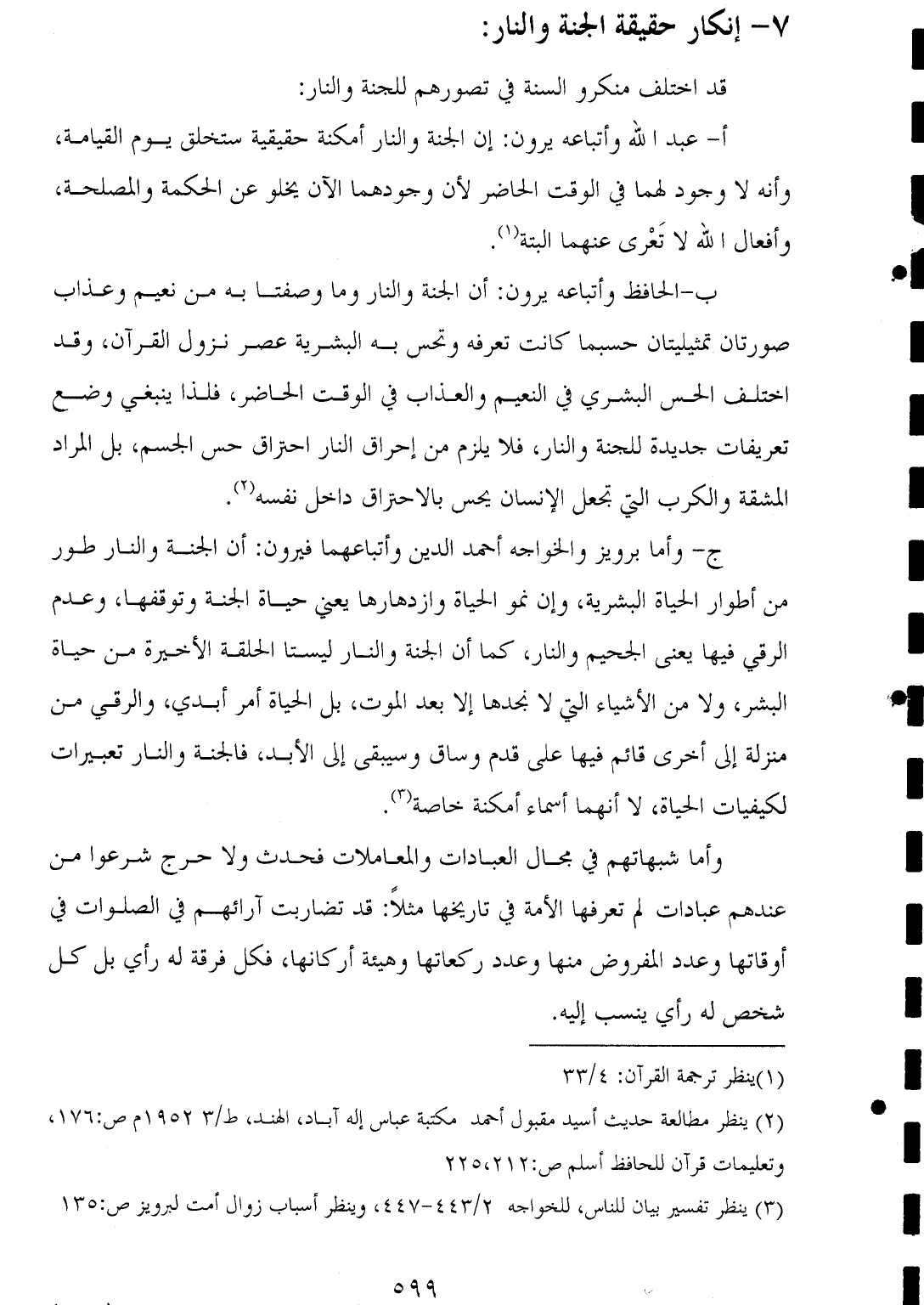 ج - وأما برويز والخواجه أحمد الدين وأتباعهما فيرون: أن الجنة والنار طور من أطوار الحياة البشرية، وإن نمو الحياة وازدهارها يعني حياة الجنة وتوقفها، وعدم الرقي فيها يعنى الجحيم والنار، كما أن الجنة والنار ليستا الحلقة الأخيرة من حياة البشر، ولا من الأشياء التي لا نجدها إلا بعد الموت، بل الحياة أمر أبدي، والرقي من منزلة إلى أخرى قائم فيها على قدم وساق وسيبقى إلى الأبد، فالجنة والنار تعبيرات لكيفيات الحياة، لا أنهما أسماء أمكنة خاصة (¬٣).