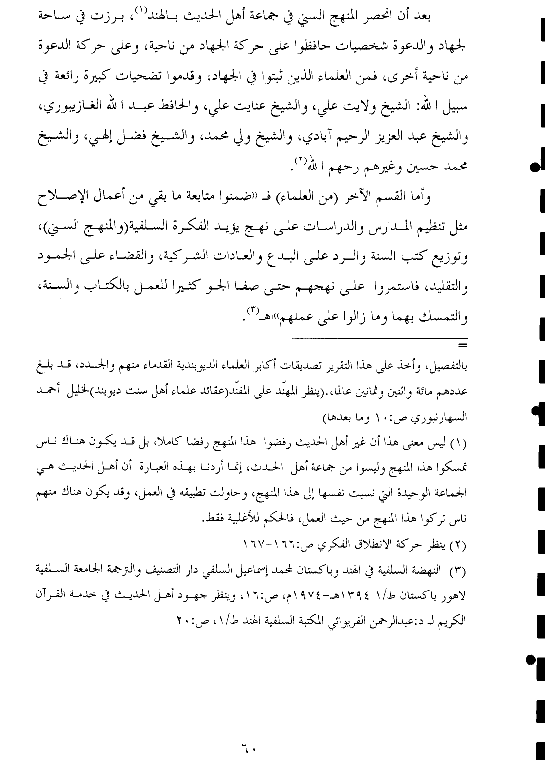 وأما القسم الآخر (من العلماء) فـ "ضمنوا متابعة ما بقي من أعمال الإصلاح مثل تنظيم المدارس والدراسات على نهج يؤيد الفكرة السلفية (والمنهج السني)، وتوزيع كتب السنة والرد على البدع والعادات الشركية، والقضاء على الجمود والتقليد، فاستمروا على نهجهم حتى صفا الجو كثيرا للعمل بالكتاب والسنة، والتمسك بهما وما زالوا على عملهم" اهـ (¬٣).