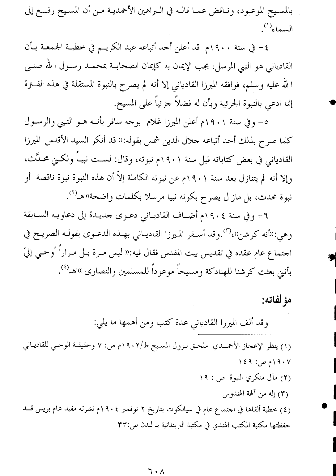 (¬٤) خطبة ألقاها في اجتماع عام في سيالكوت بتاريخ ٢ نوفمبر ١٩٠٤ م نشرته مفيد عام بريس قد حفظتها مكتبة المكتب الهندي في مكتبة البريطانية بـ لندن ص: ٣٣.