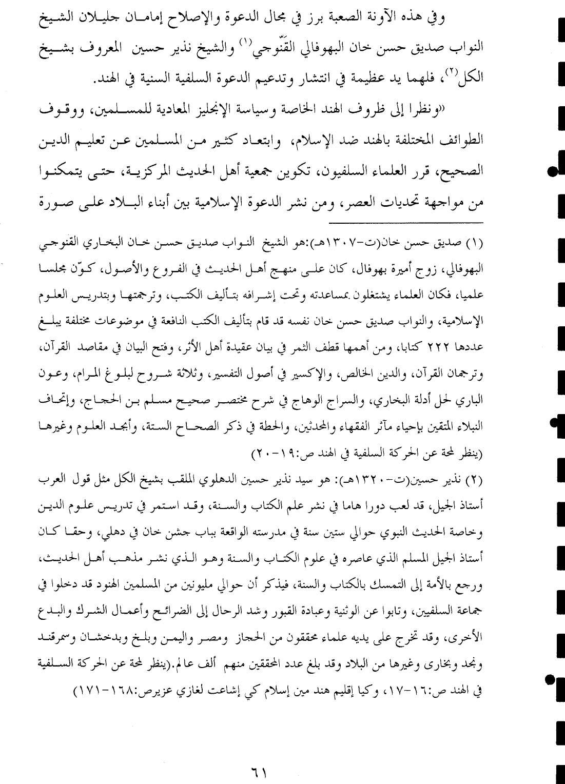 (¬١) صديق حسن خان (ت-١٣٠٧ هـ): هو الشيخ النواب صديق حسن خان البخاري القنوجي البهوفالي، زوج أميرة بهوفال، كان على منهج أهل الحديث في الفروع والأصول، كوّن مجلسا علميا، فكان العلماء يشتغلون بمساعدته وتحت إشرافه بتأليف الكتب، وترجمتها وبتدريس العلوم الإسلامية، والنواب صديق حسن خان نفسه قد قام بتأليف الكتب النافعة في موضوعات مختلفة يبلغ عددها ٢٢٢ كتابا، ومن أهمها قطف الثمر في بيان عقيدة أهل الأثر، وفتح البيان في مقاصد القرآن، وترجمان القرآن، والدين الخالص، والإكسير في أصول التفسير، وثلاثة شروح لبلوغ المرام، وعون الباري لحل أدلة البخاري، والسراج الوهاج في شرح مختصر صحيح مسلم بن الحجاج، وإتحاف النبلاء المتقين بإحياء مآثر الفقهاء والمحدثين، والحطة في ذكر الصحاح الستة، وأبجد العلوم وغيرها (ينظر لمحة عن الحركة السلفية في الهند ص: ١٩ - ٢٠).