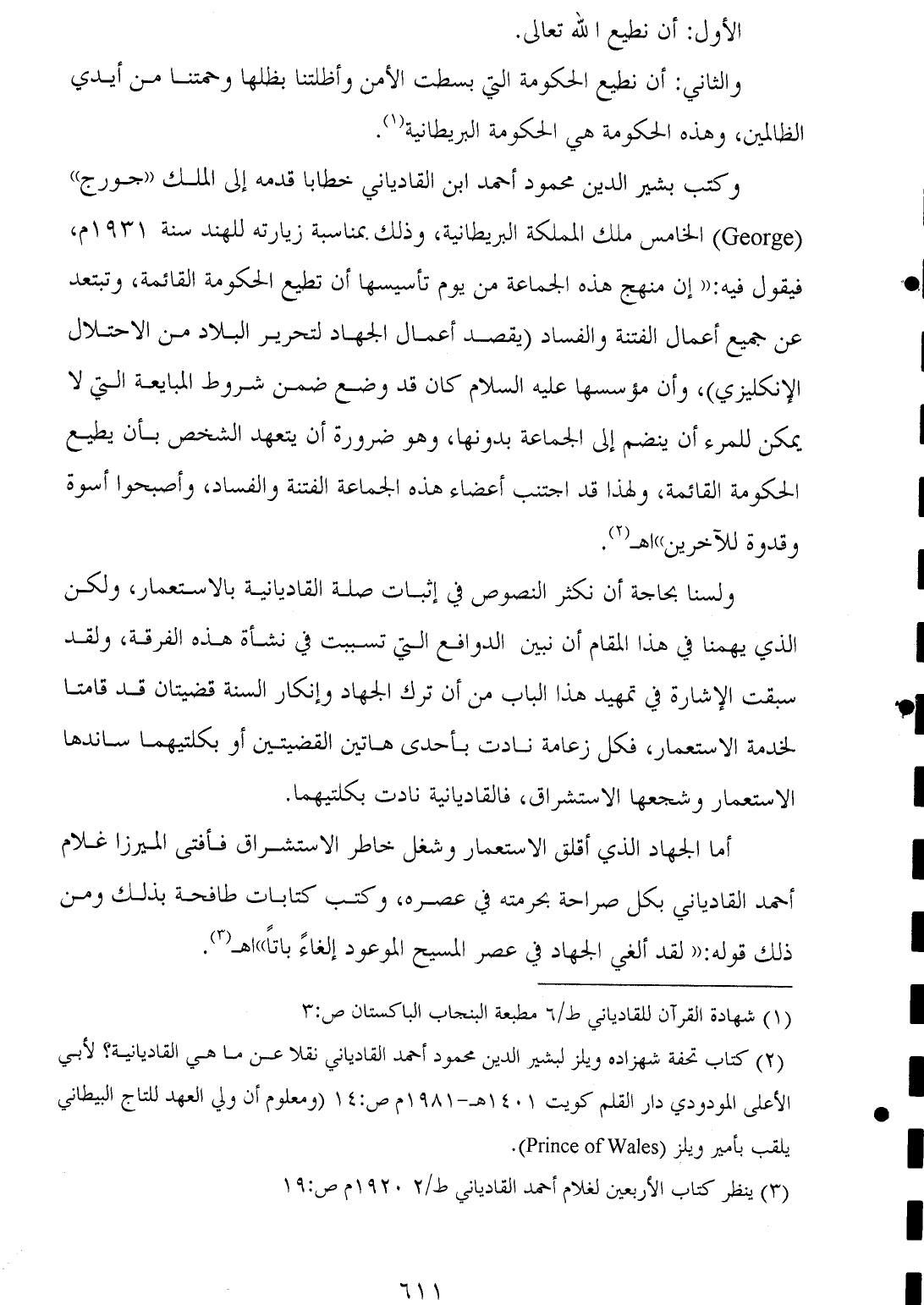 أما الجهاد الذي أقلق الاستعمار وشغل خاطر الاستشراق فأفتى الميرزا غلام أحمد القادياني بكل صراحة بحرمته في عصره، وكتب كتابات طافحة بذلك ومن ذلك قوله: "لقد ألغي الجهاد في عصر المسيح الموعود إلغاءً باتًا" اهـ (¬٣).